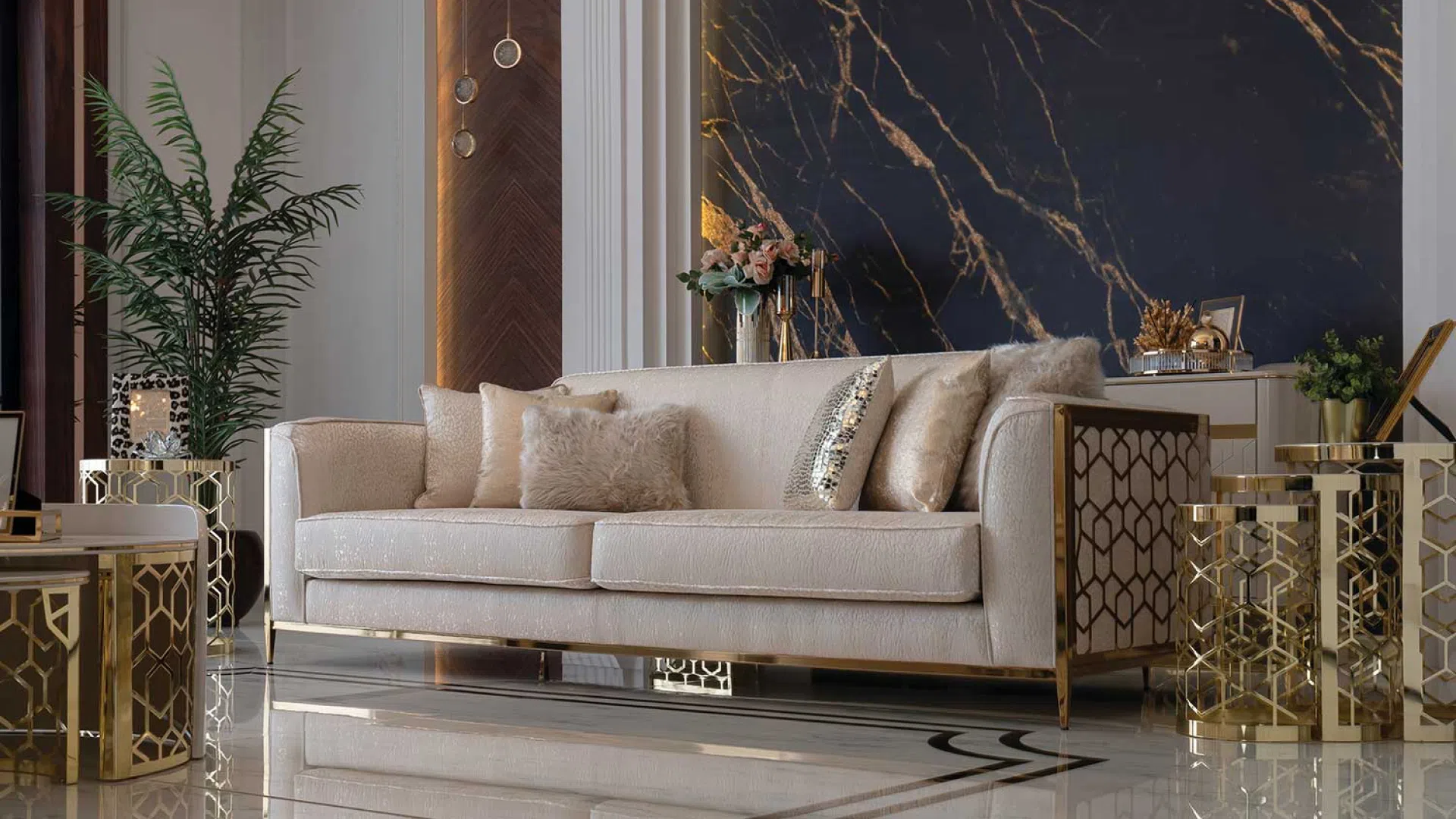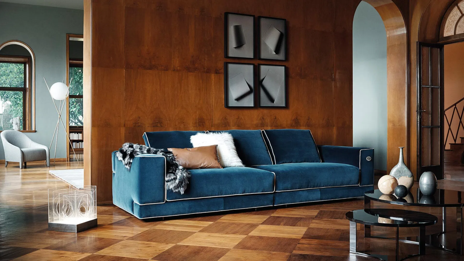 Equally important is the modular and architectural design language: sofas, armchairs, and sideboards follow clean, expansive geometries, yet are softened by tactile upholstery and subtle decorative motifs.