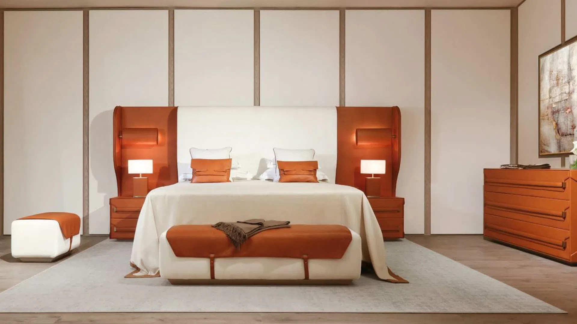 In the bedroom, pieces such as the Fiorichiari bed demonstrate multifunctionality and a sense of refinement. Having a bleached ash structure and headboard in cream leather with integrated bedside lamps, this bed manages to merge restful elegance with practical sophistication, perfect for modern homes that value fluidity of use without compromising on beauty.