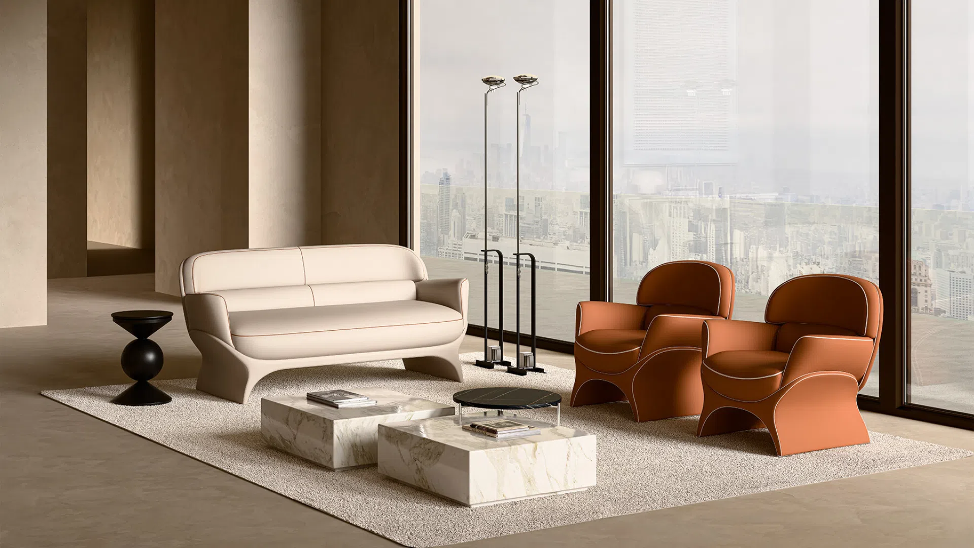 In the living room, Mascheroni pieces become sculptural focal points. Upholstered sofas introduce fluid, dynamic silhouettes that redefine comfort and visual balance. Monoblock forms and rich fabrics shape the space's atmosphere, creating interiors that feel welcoming yet unmistakably refined. Lounge chairs add movement and lightness, responding naturally to the body while lending a poetic, almost floating presence to the room.