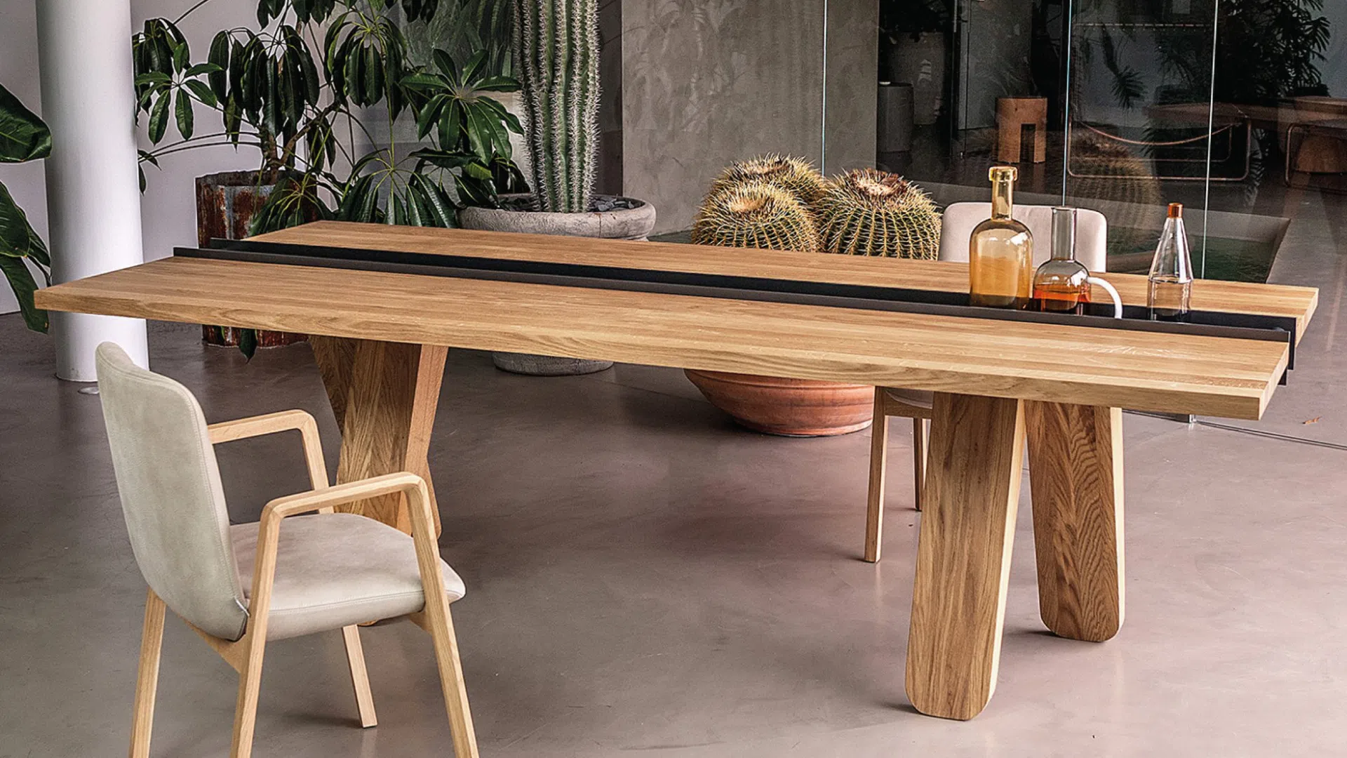 In the dining room, Riva 1920 expresses its most theatrical side. Tables carved from centuries-old walnut, oak, or kauri become the heart of the space — surfaces marked by time that turn every meal into a ritual. Chairs and benches combine ergonomic comfort with refined simplicity, creating dining environments that feel both welcoming and iconic.