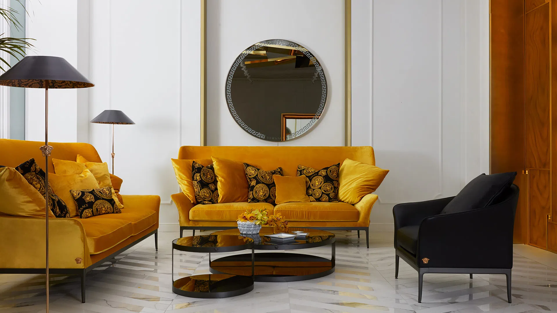 A living room furnished with Versace pieces becomes a statement of character — ornamental yet modern, expressive yet impeccably balanced. Natural wood, supple leather, marble, glass, and touches of gold or silver transform everyday comfort into a curated experience.