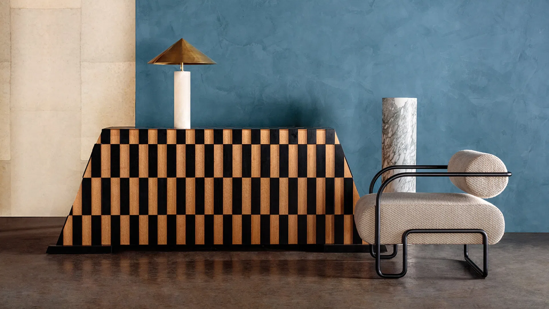 Storage and statement case-goods also receive Wearstler's artistic treatment: the Colina credenza — a monolithic resin sideboard with a plaster-like finish — transforms functional storage into a sculptural, tactile object.