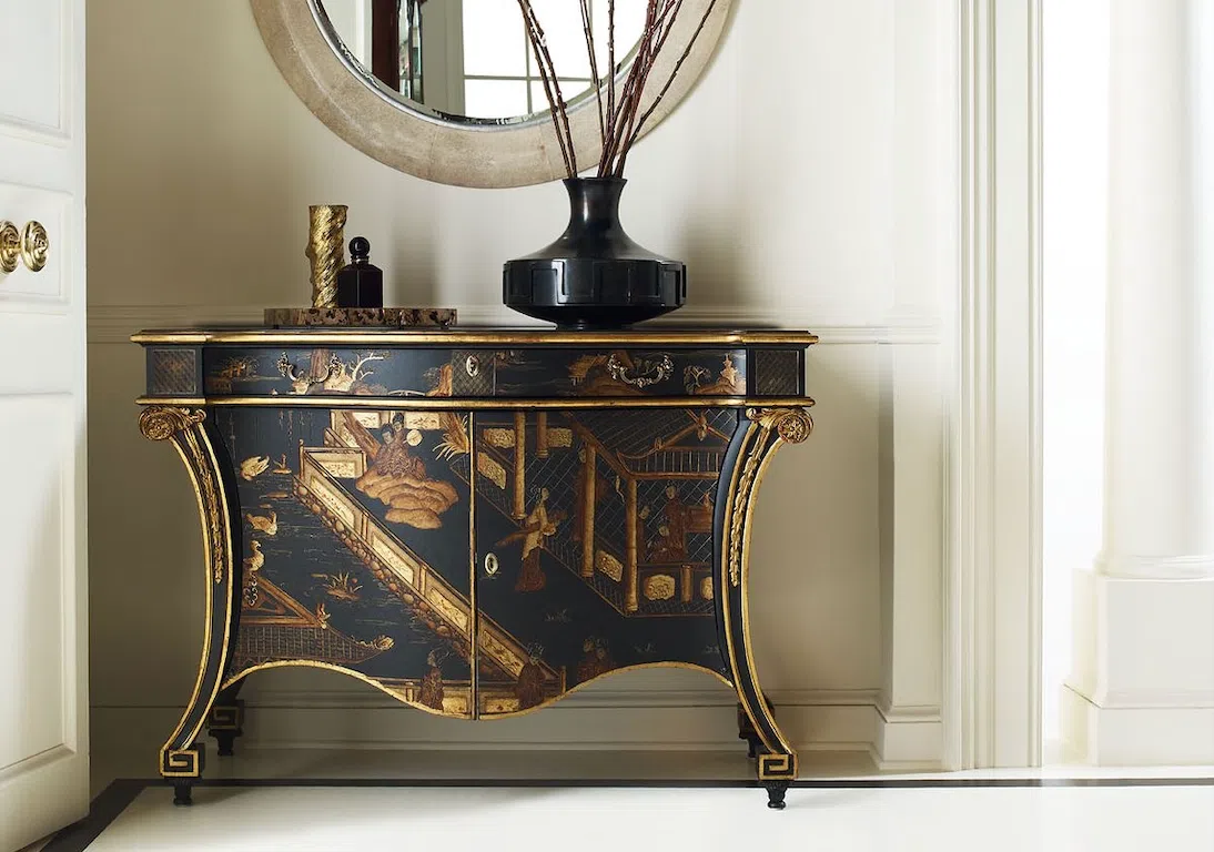 Chinese furniture has always exuded luxury and sophistication due to its texture, exquisite painting, and glossy lacquer coating. The lacquering process demanded meticulous attention, with the number of layers reaching up to 30 or more. Another distinctive feature of chinoiserie is intricate carving, giving a sense of lightness and airiness. Cabinet doors and drawers were adorned with elaborate patterns, while table and dressing table legs took the form of animals or even multi-tiered pagodas.