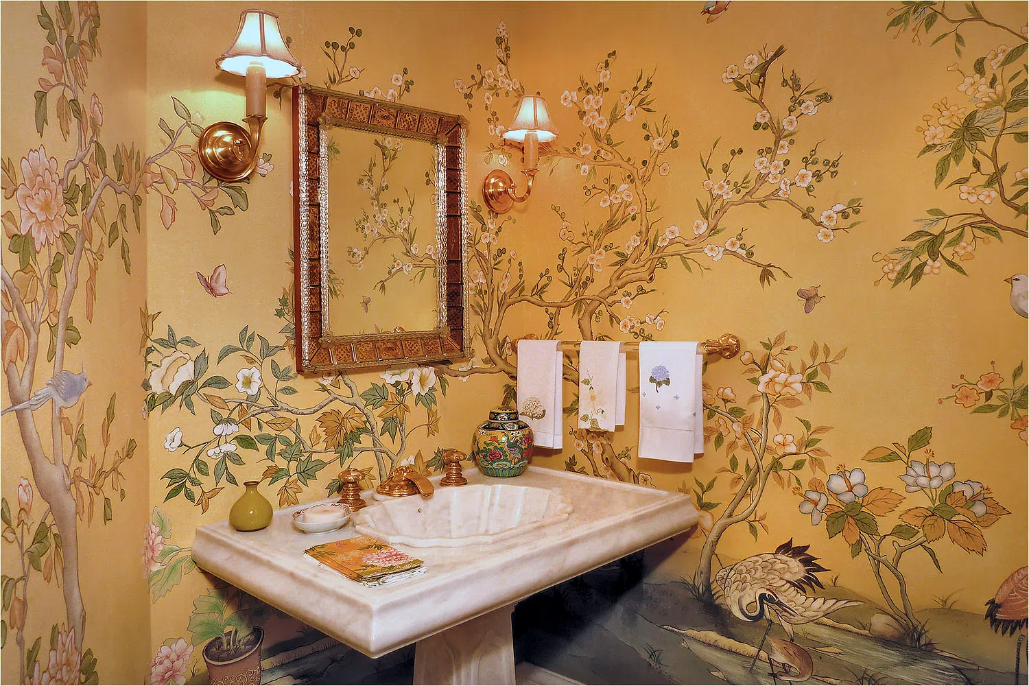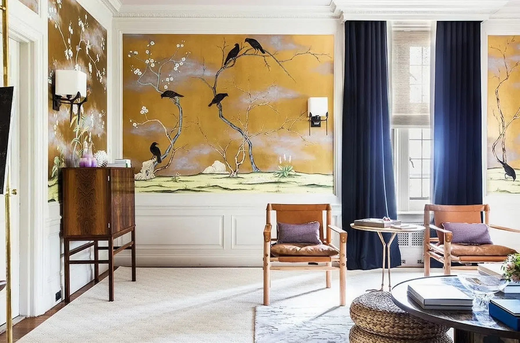 For those who want to surround themselves with art, silk wallpapers featuring Chinese motifs can be an ideal solution. Originally, rice paper and silk fabrics were used, hand-painted with lapis lazuli, malachite, and other mineral-based pigments. Such wallpapers were costly, so only small sections of walls had such decoration. A modern alternative to Chinese silks can be textured wallpapers with bold Eastern prints or ethnic motifs. This adaptation of chinoiserie adds vibrancy to the interior, creating an atmosphere of warmth and coziness through its softness and tactility.