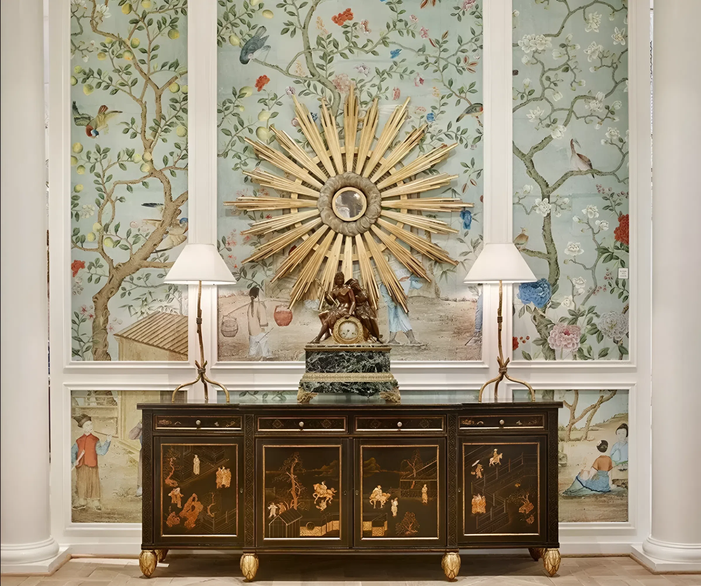 Picturesque paintings of blossoming gardens, graceful pagodas, exotic birds, and scenes of daily life are all signature details of chinoiserie. Typically, pure and vibrant colors like yellow, green, blue, and red, often accentuated with gold or silver, are preferred. In a modern interior, such paintings can adorn an accent wall or a panel behind the bed, bringing some vividness and a touch of Eastern magic to the space.