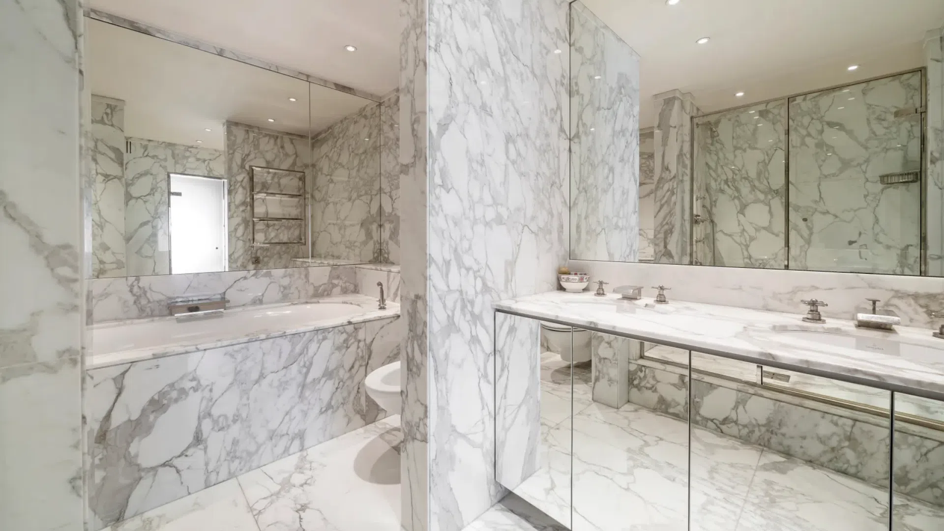 The luxurious bathroom adjoining the bedroom is fully finished in marble. It features numerous mirrored surfaces that visually expand the space and fill it with light.