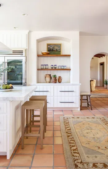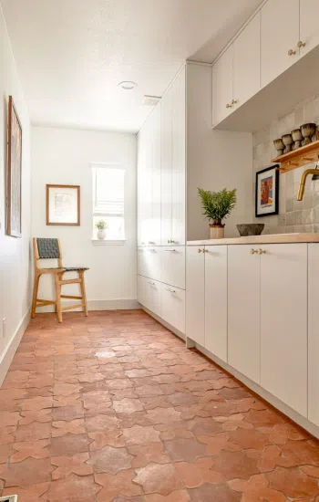 Thanks to its stylish natural appearance, terracotta flooring can create a cozy and warm atmosphere in the kitchen. This flooring harmoniously fits into country, Provence, or Mediterranean-style interiors.