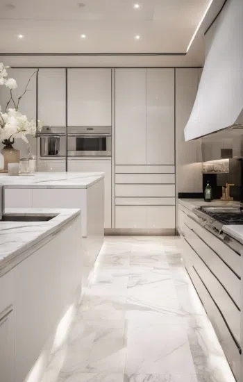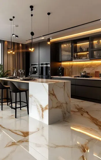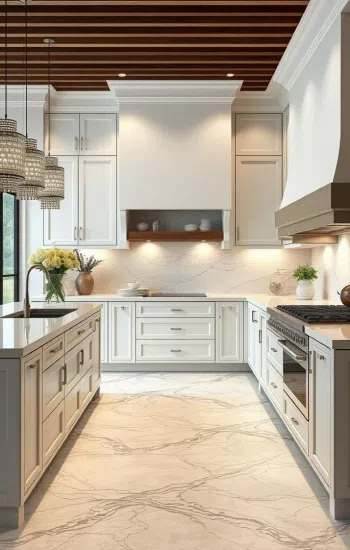 Marble flooring can also be a suitable option for the kitchen if you aim to bring elegance and luxury to the space. Despite the need for careful maintenance, this material can create a stunning interior that combines beauty and functionality.