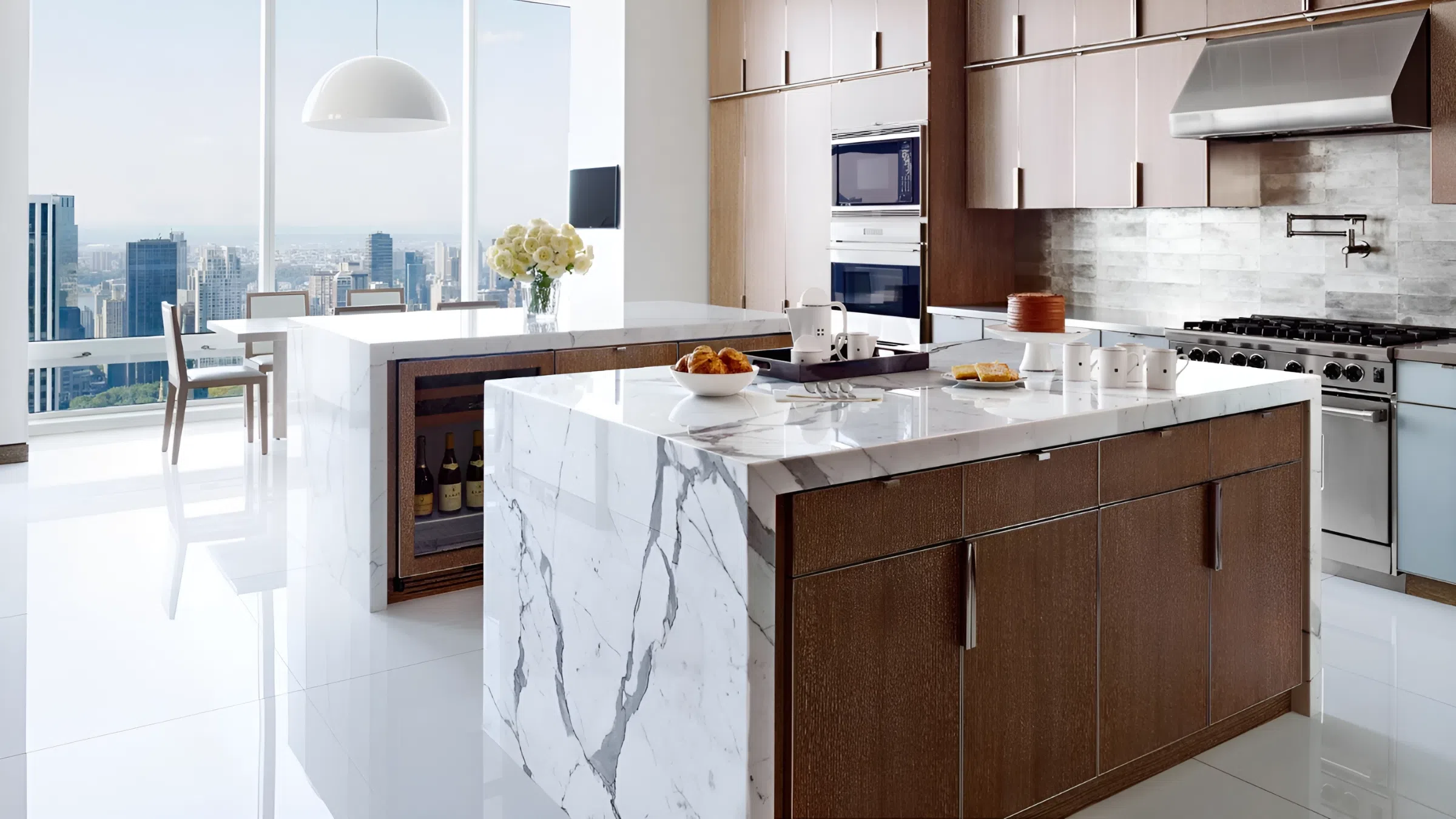 When choosing materials for a kitchen island, it's worth paying attention to the combination of marble and metal. This allows you to create a stylish and modern interior while maintaining the functionality and durability of the structure. A good alternative to marble can be ceramic granite, which is no less aesthetic in texture but much easier to maintain and retains its original appearance for a long time.