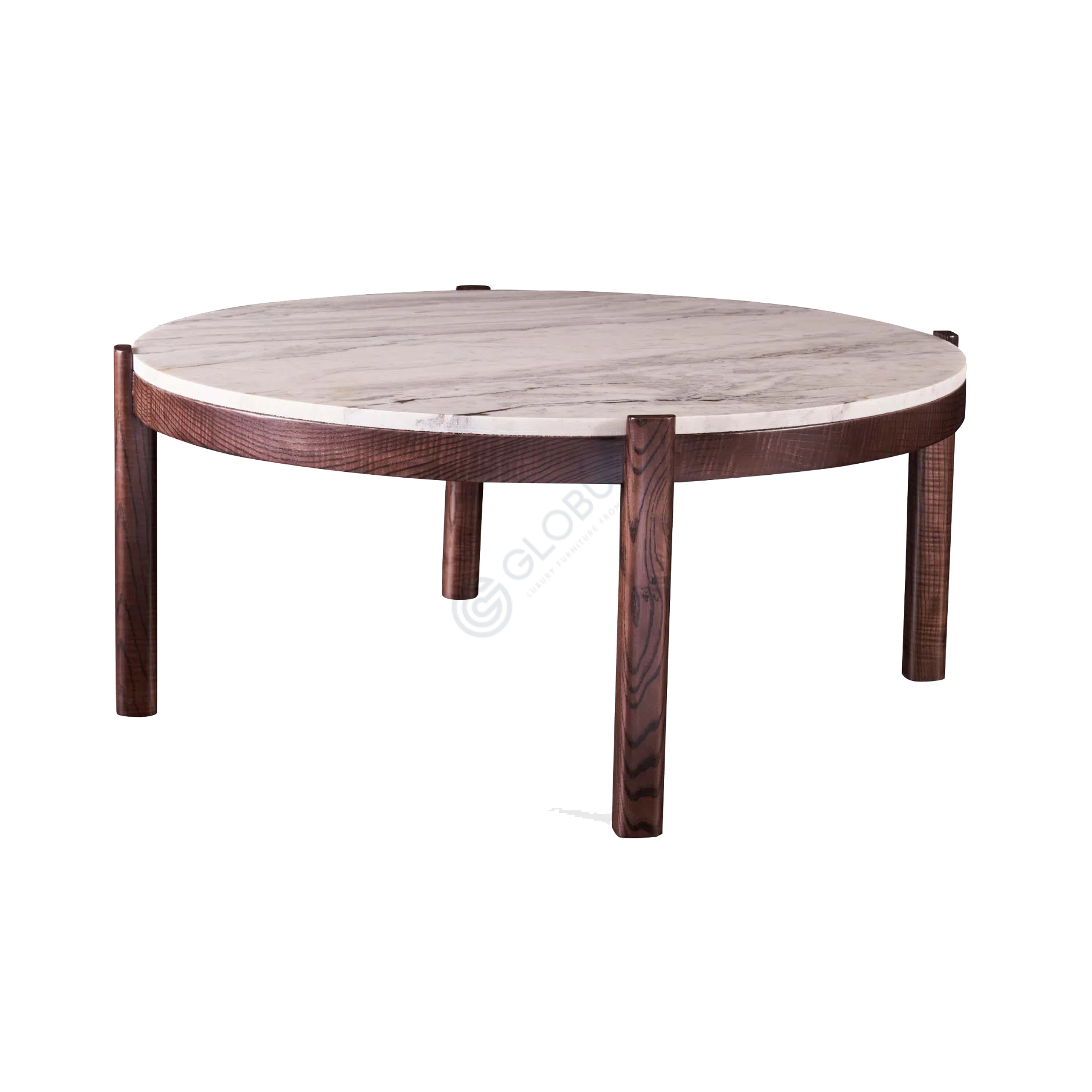 The round tabletop features natural stone patterns, making each piece unique, while its sturdy wooden legs provide lasting stability. This side table is ideal for small spaces, serving as a perfect companion for your favorite reading nook or beside a cozy sofa.