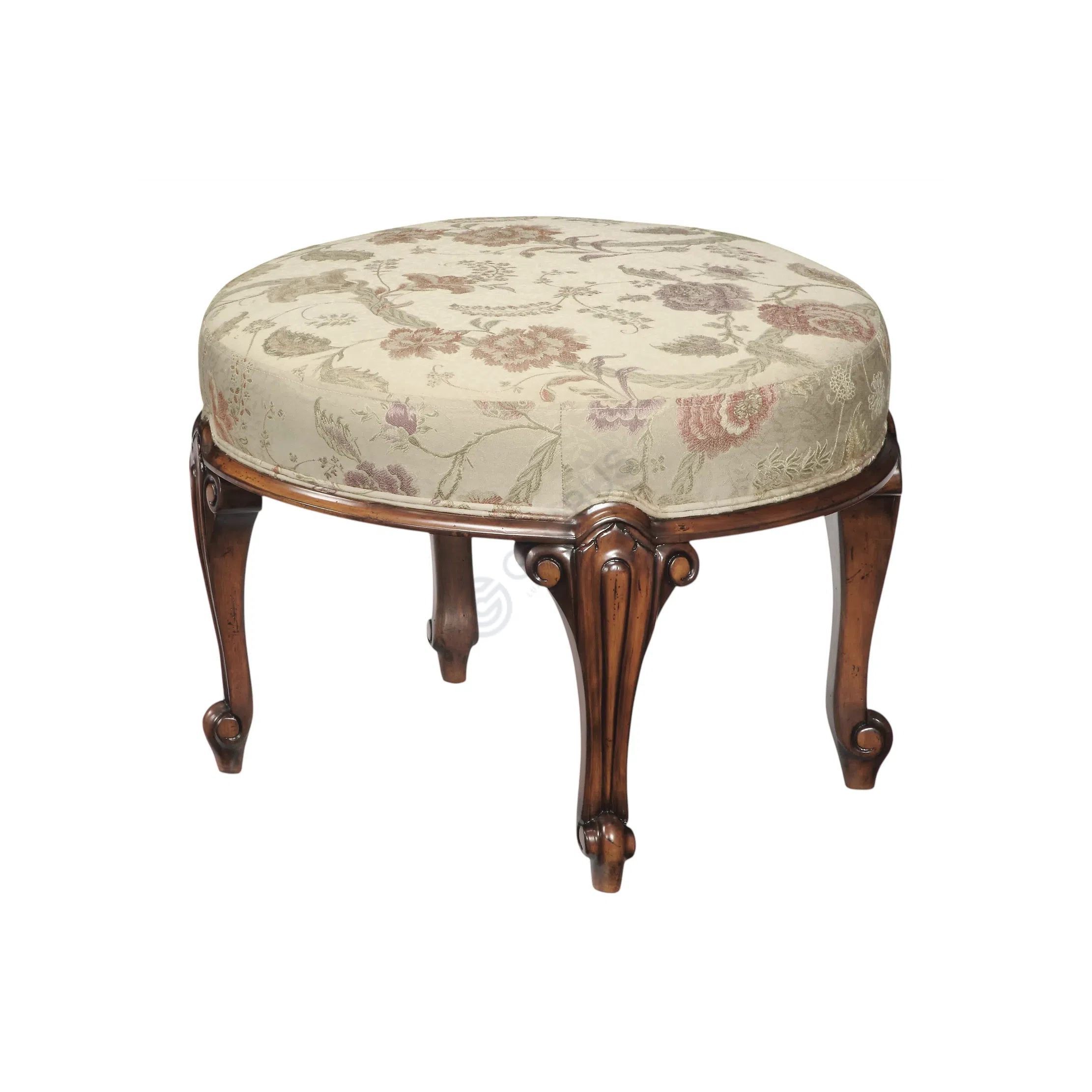 The padded seat and tufted backrest are upholstered with a soft, high-quality textile adorned with a floral pattern, blending comfort and charm seamlessly. The upholstery complements the woodwork while creating a cozy, inviting seating experience.