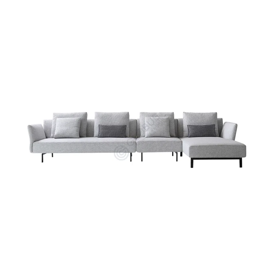 Its internal structure combines solid wood and plywood for stability, while sleek metal legs provide support and elevate the design. Plush back cushions and accent pillows invite relaxation. This piece is designed to integrate seamlessly into a modern living space, providing both comfort and refined style.