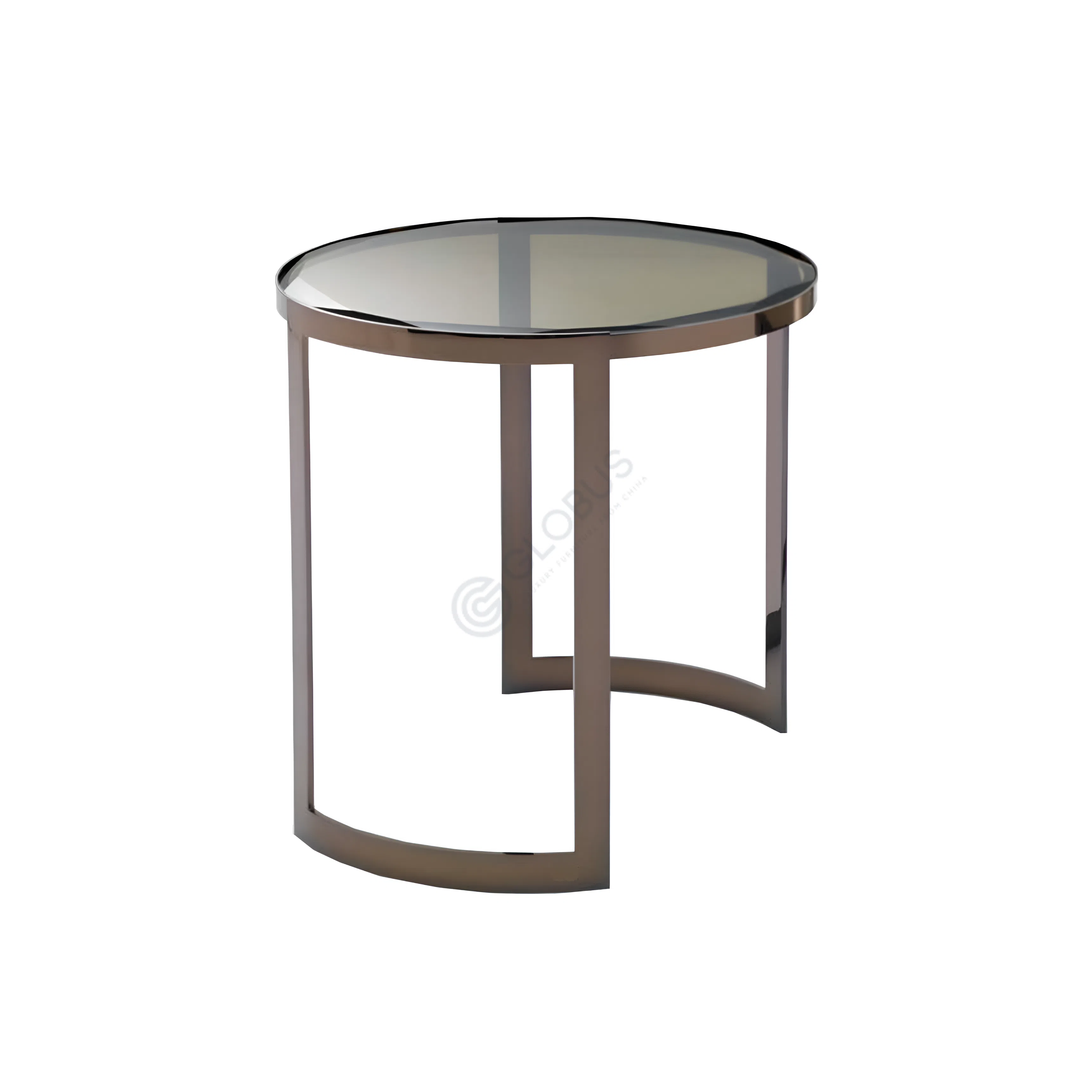 Crafted for durability and style, the tabletop is made from tempered glass, offering a smooth, resilient surface. The supporting structure consists of a sculptural base fashioned from stainless steel, providing stable support while adding a distinctive visual element.