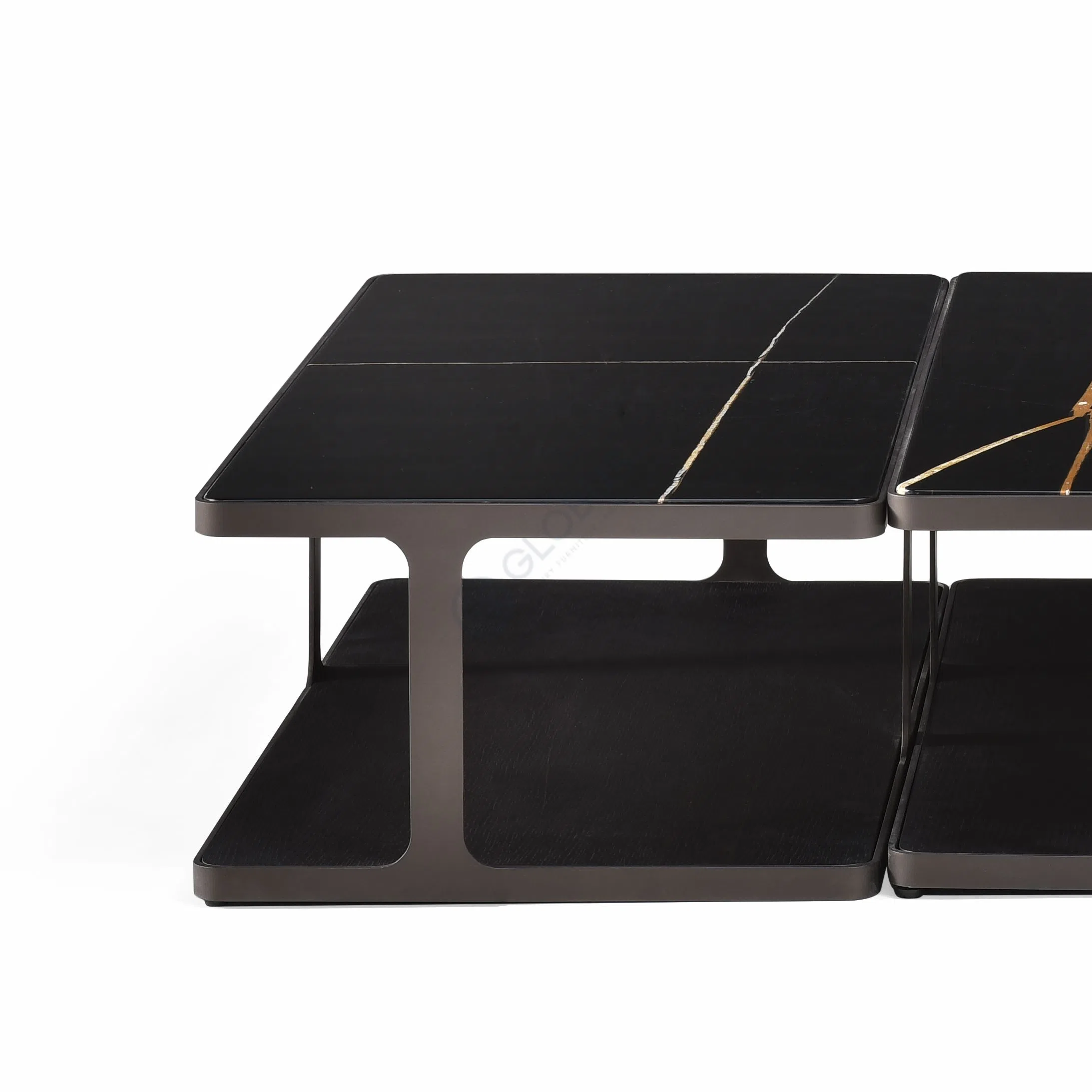 The top and lower surfaces of the table are made from smooth ceramic, providing a functional yet refined look. The ceramic finish boasts a marble-like appearance, enhancing its visual appeal while ensuring easy cleaning and maintenance.