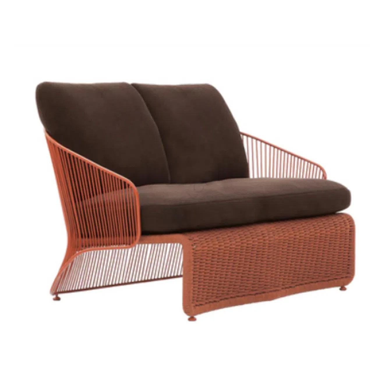 This armchair presents a striking modern form, perfect for a contemporary living room setting. Its design is defined by an elegant, dark metal wireframe that creates a light yet sculptural silhouette. Soft, plush textile cushions provide a welcoming contrast to the frame's structure, inviting relaxation.