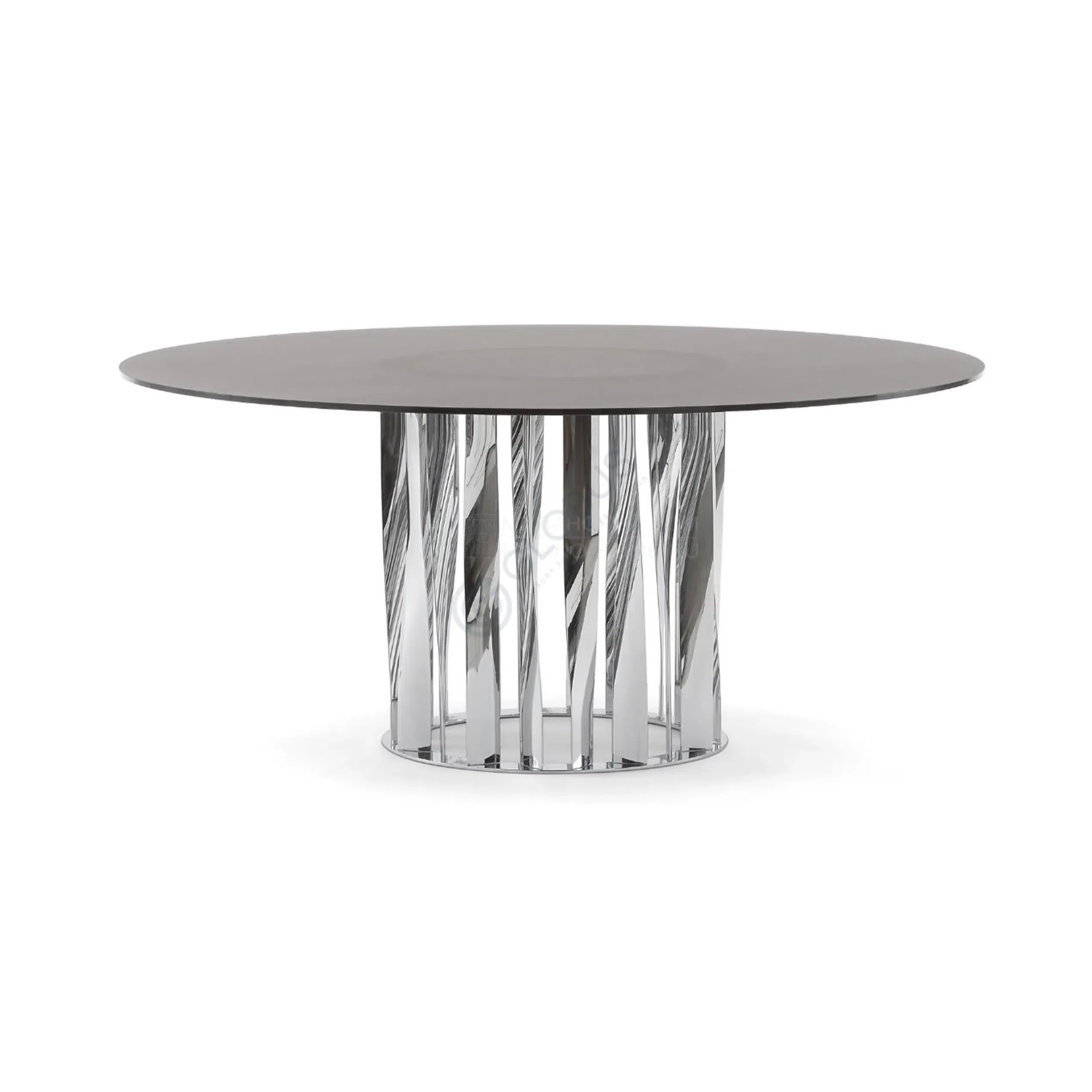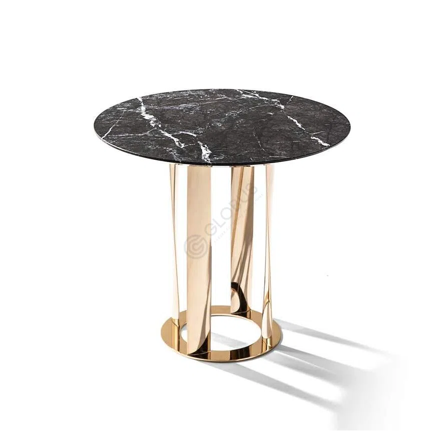 The design artfully merges Art Deco flair with modern simplicity. The base, composed of multiple curved vertical elements, creates a dynamic yet stable foundation that enhances the table's luxurious aesthetic. This piece acts as a central point of style and function, perfect for gathering around or displaying cherished items.