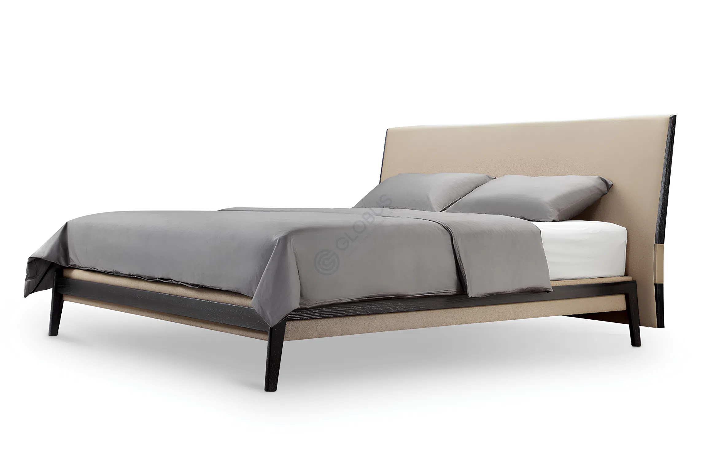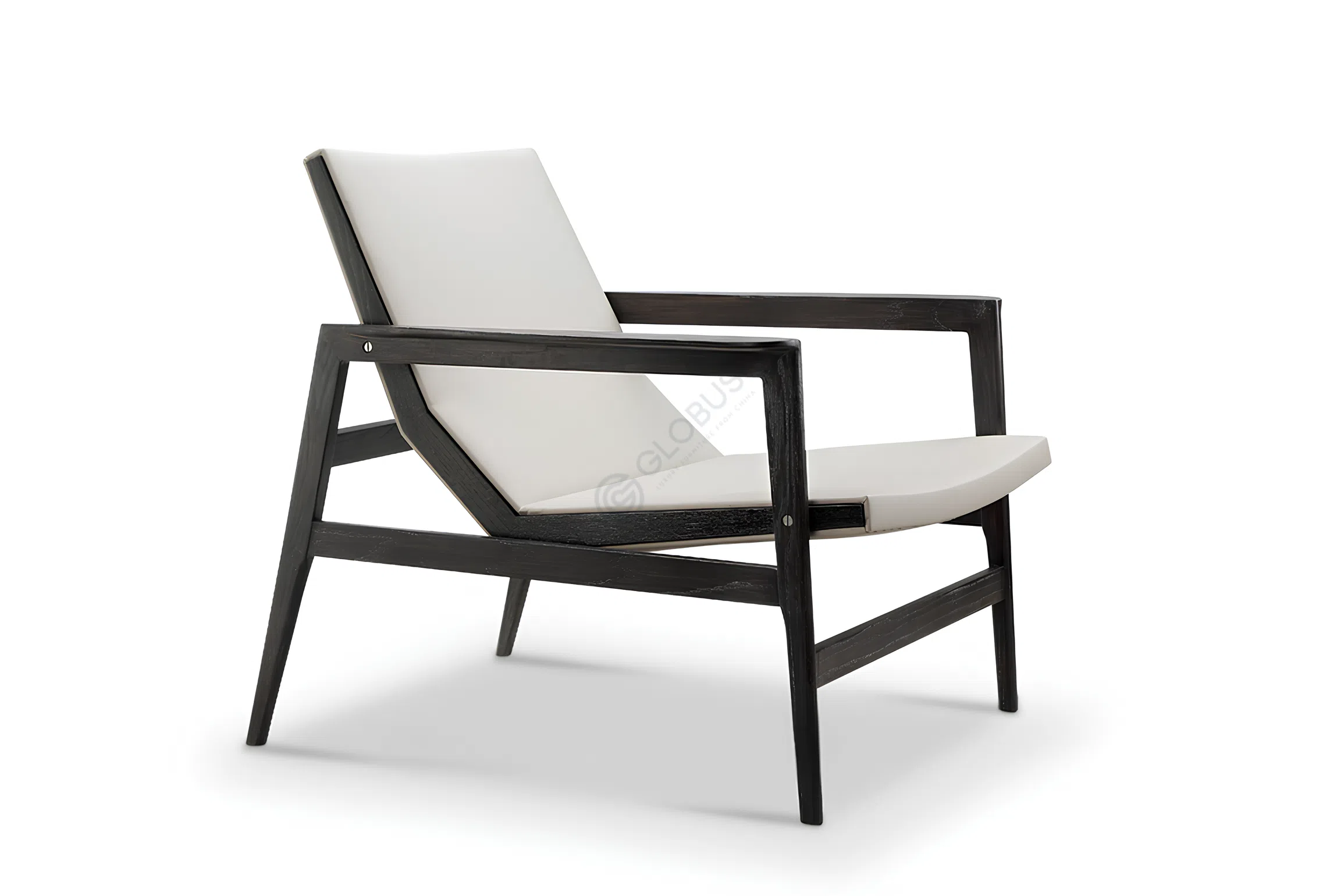 The seat and backrest are upholstered in a high-quality textile, offering both comfort and a smooth finish that complements contemporary interiors. The neutral tones of the fabric blend seamlessly with the deep wood tones, giving this chair a versatile appeal that suits various styles and color palettes.