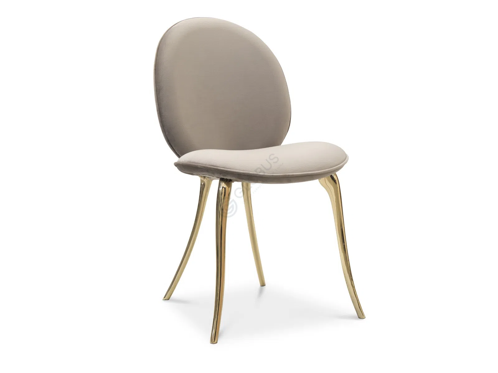Constructed with a sturdy solid wood frame, this sofa features distinctive design elements. Polished brass accents curve around the rounded arms, creating a unique and luxurious detail. A thin band of brass elegantly traces the lower edge, highlighting the sofa's sophisticated form.