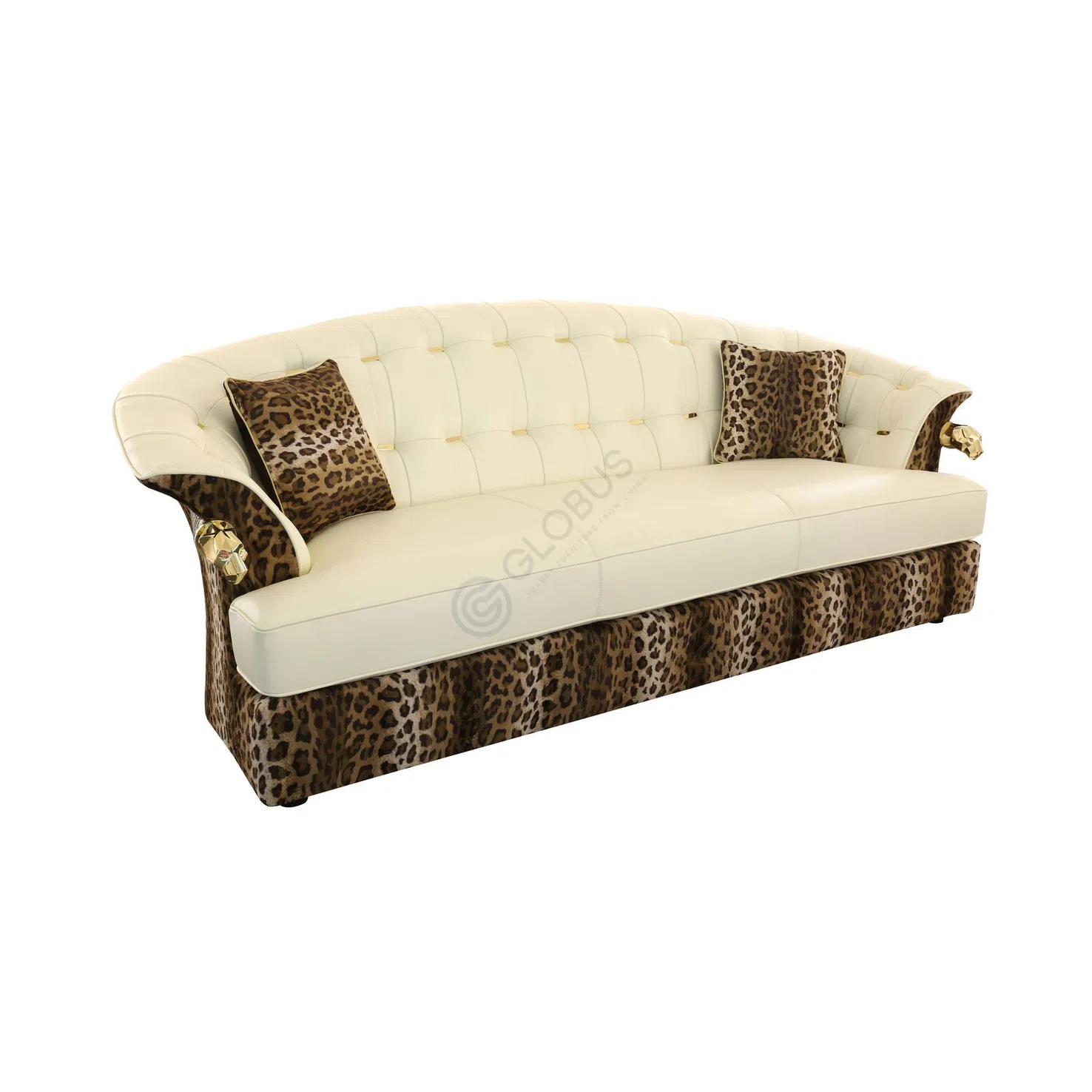 The armchair is upholstered using a mix of fine materials. A bold leopard print textile covers the base and outer back, while the seat and inner back are finished in elegant cream-colored leather. The inner back includes classic button tufting detail.
