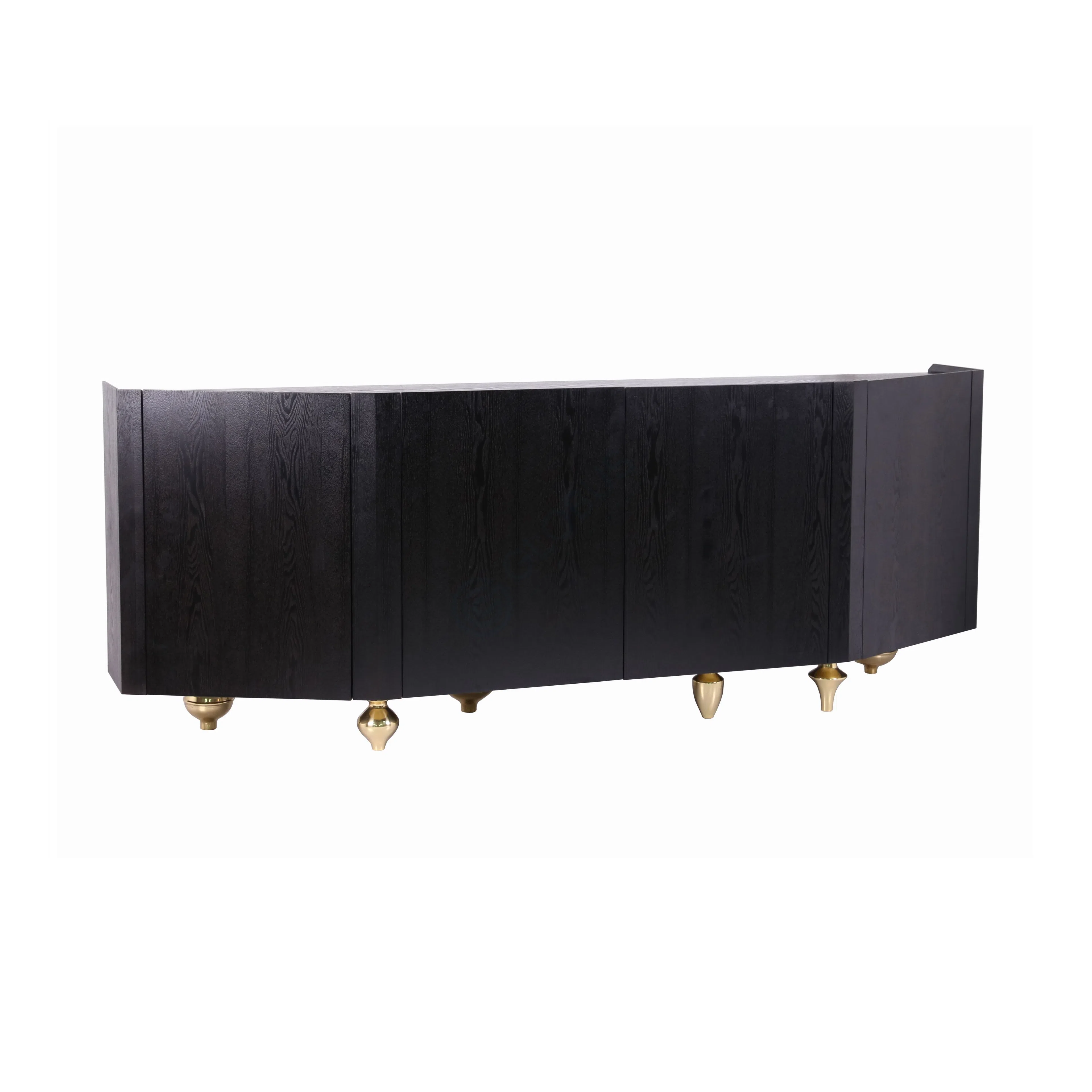 The ottoman is supported by four solid brass legs. Each leg is crafted with a distinctive, subtly shaped form, adding a touch of polished sophistication. The combination of the sturdy internal solid wood structure and the gleaming brass accents highlights the quality craftsmanship and premium materials used.