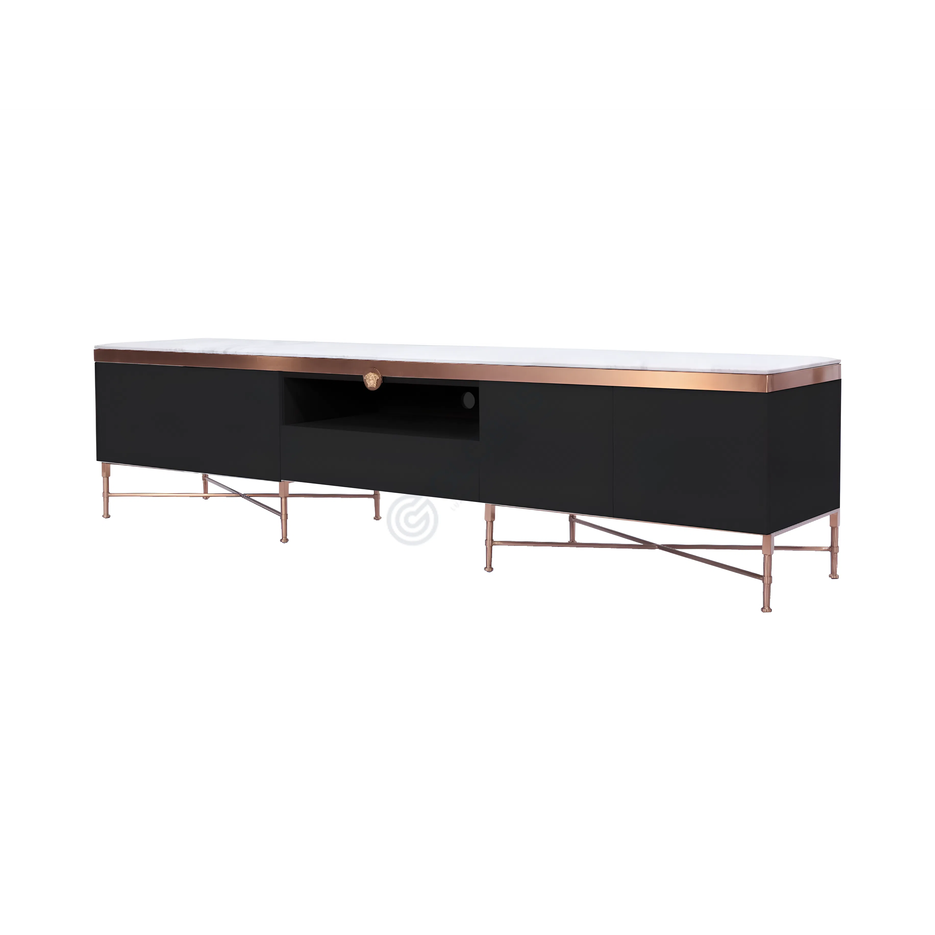 Supporting the console are slender legs made from stainless steel, finished in a combination of polished gold and deep black for striking contrast. Carefully detailed, the gold framework includes decorative lion’s head medallions—a nod to classic Art Deco motifs—placed at the upper corners for added character.