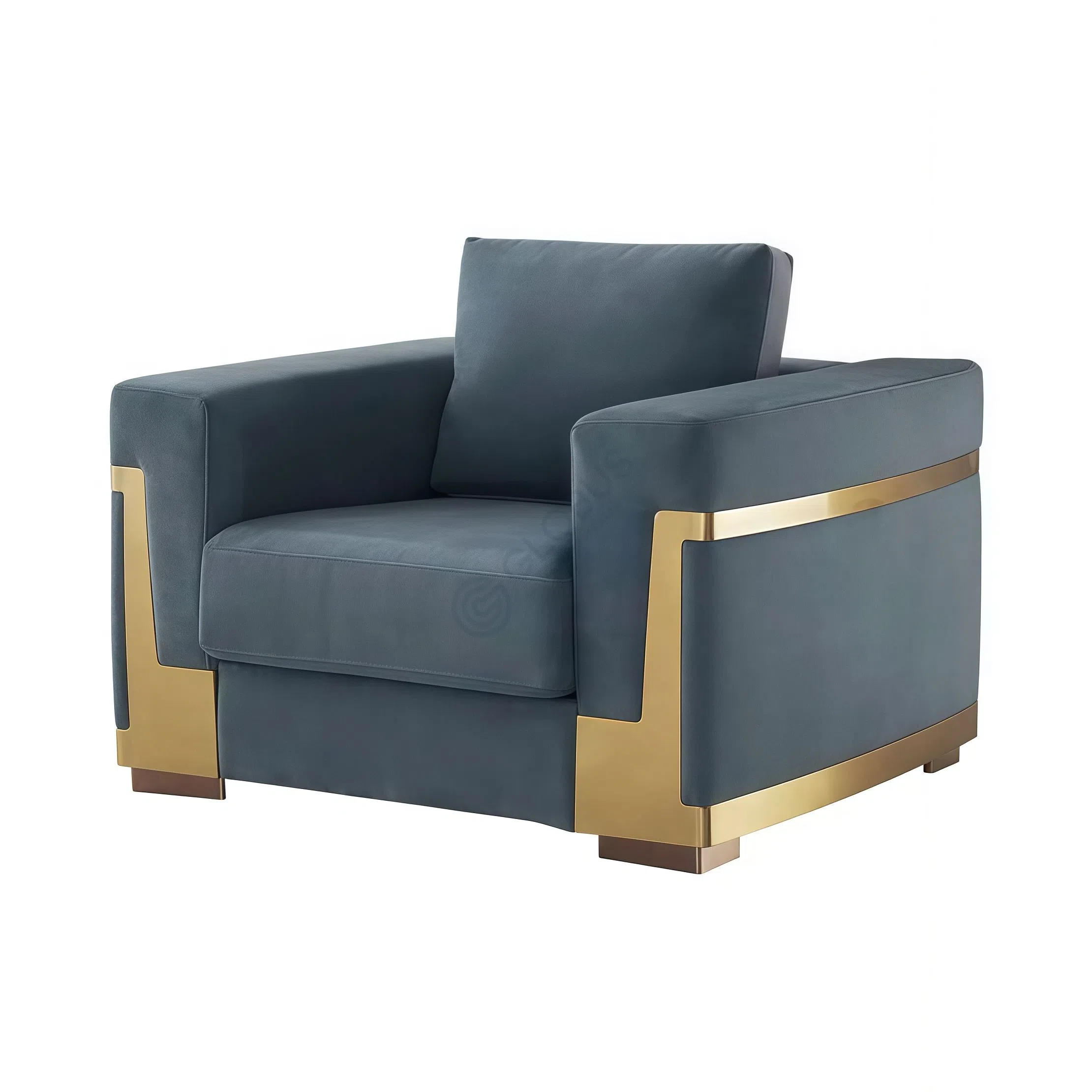 Distinctive details define this piece. The broad, structured arms are adorned with sleek, polished stainless steel accents that gracefully frame the sides and lower edge. These golden-hued elements provide a captivating contrast to the deep textile, creating a refined silhouette that speaks of meticulous craftsmanship.