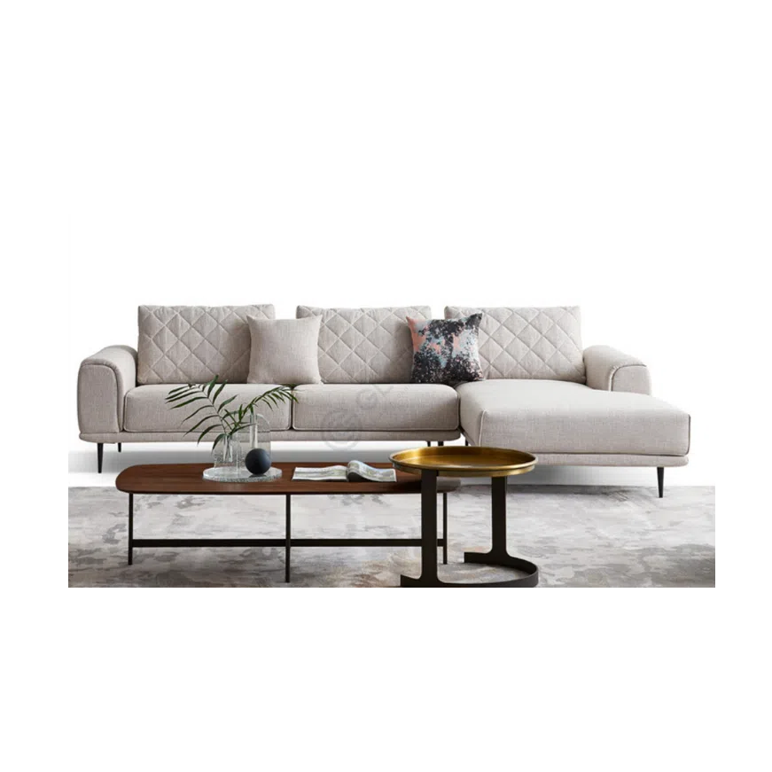 This modern sofa presents a refined profile, designed to bring both comfort and contemporary style to a living room. Its upholstery in a soft, neutral textile offers a pleasant feel and a versatile look that complements various interior palettes. The clean lines of the frame, supported by slender metal legs, create an airy feel and elevate the piece.