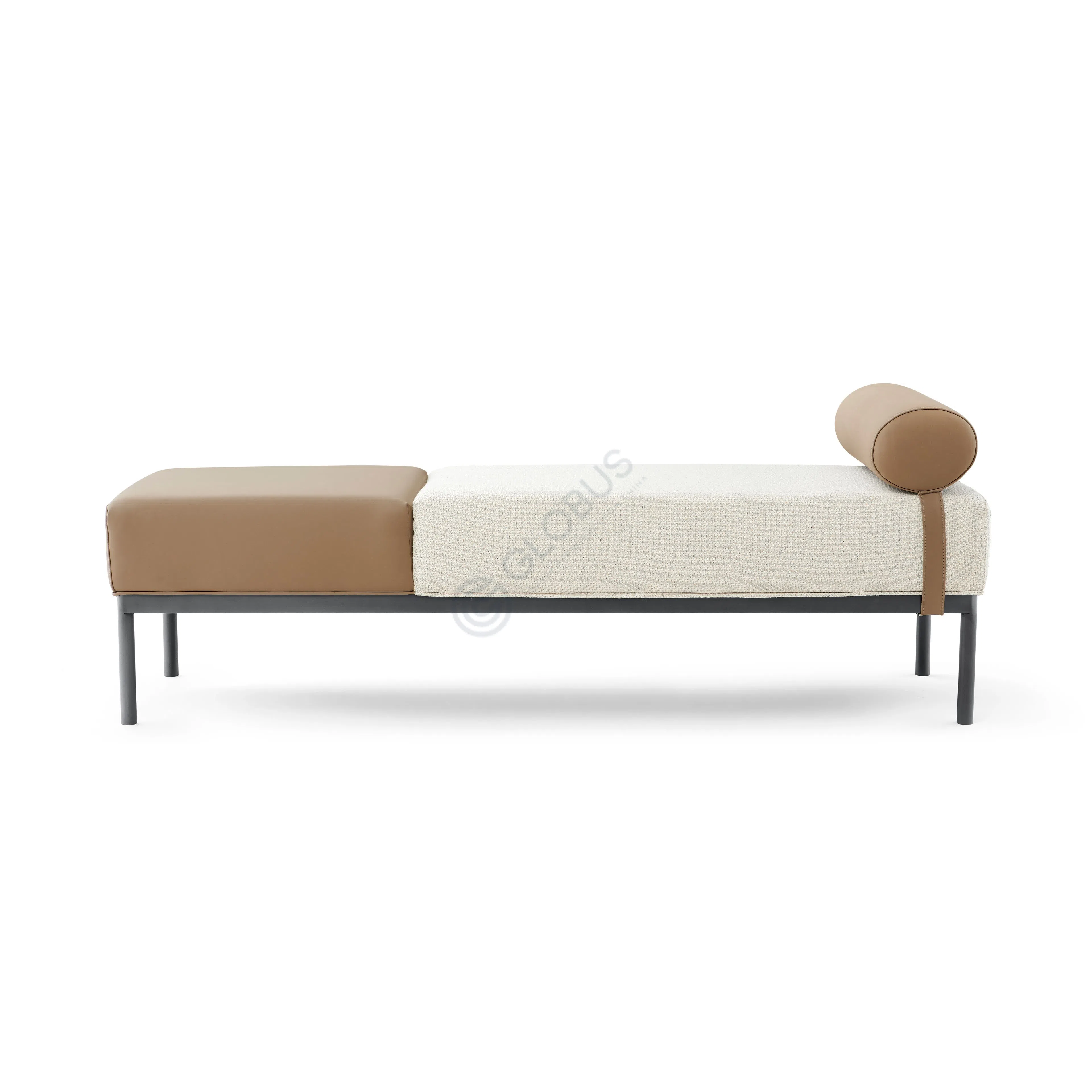 Crafted with quality textile upholstery for a comfortable feel, this piece rests upon a sturdy metal frame and legs, supported by a durable internal plywood structure. A distinct cylindrical bolster cushion, secured by a strap, adds both comfort and a touch of detail.