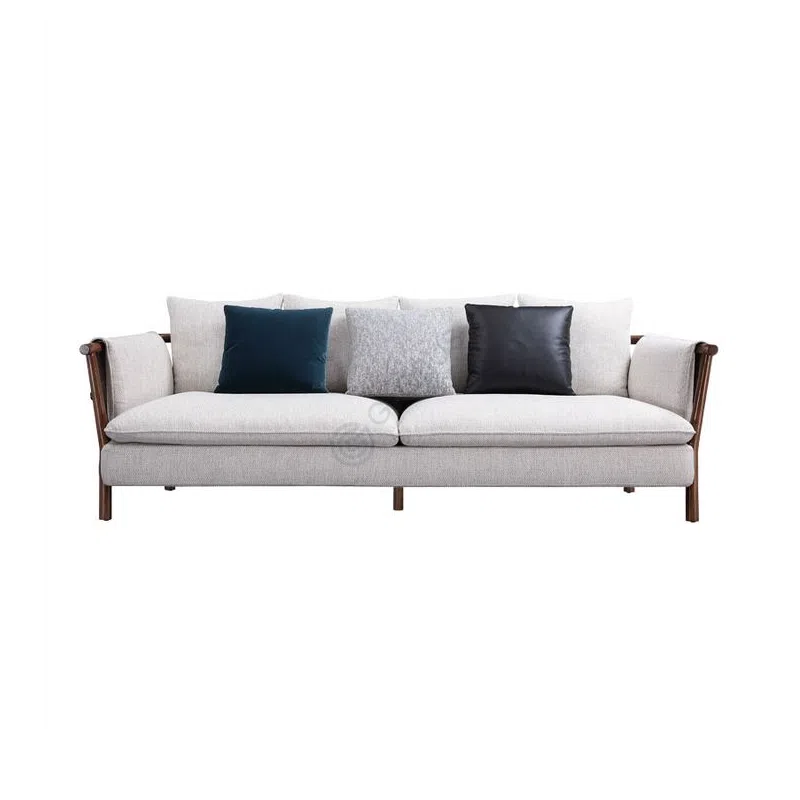 Generously cushioned seating, upholstered in a tactile textile fabric, provides an inviting place to relax. The light, neutral tone of the upholstery complements the wooden frame, creating a balanced and harmonious look. The texture of the fabric suggests durability and comfort.