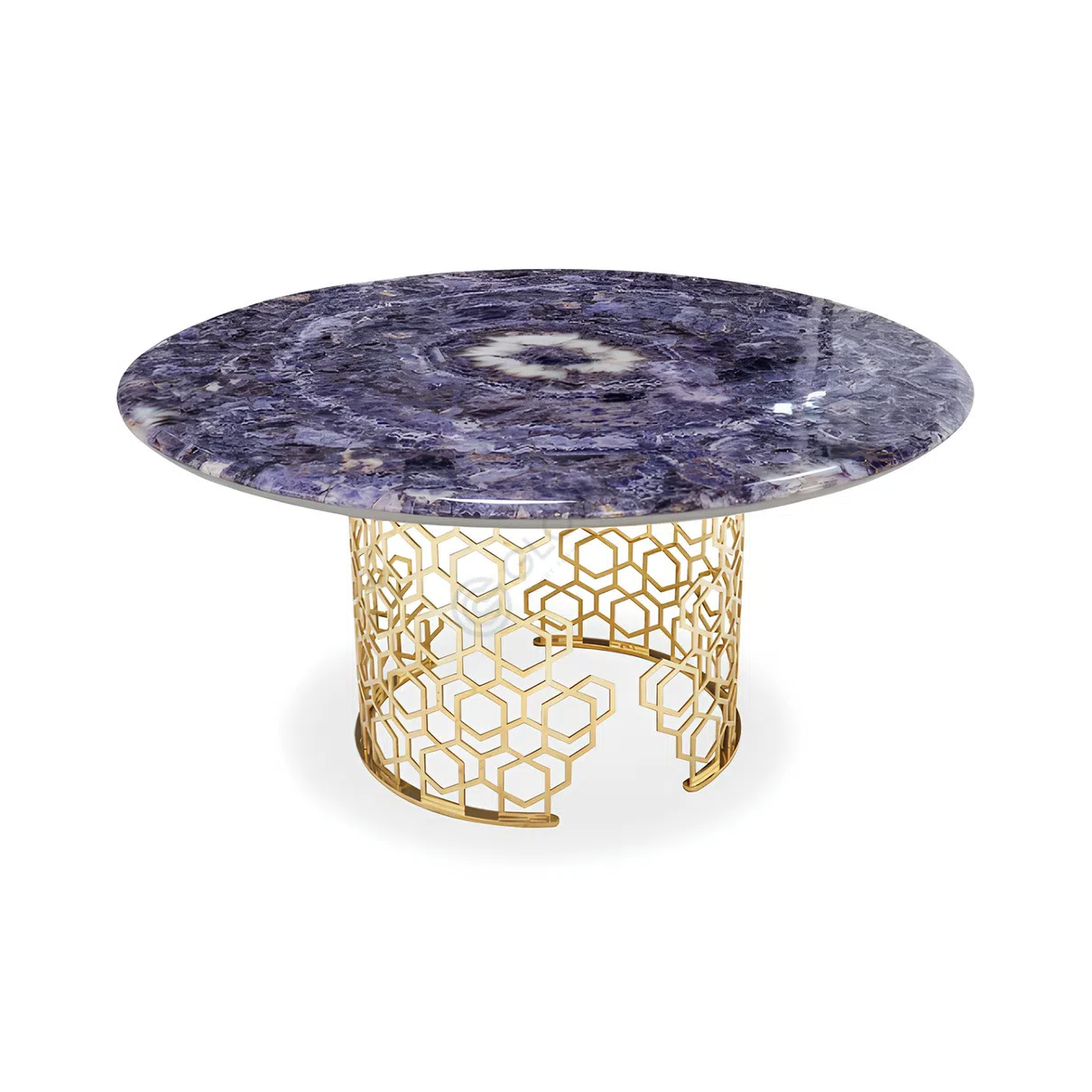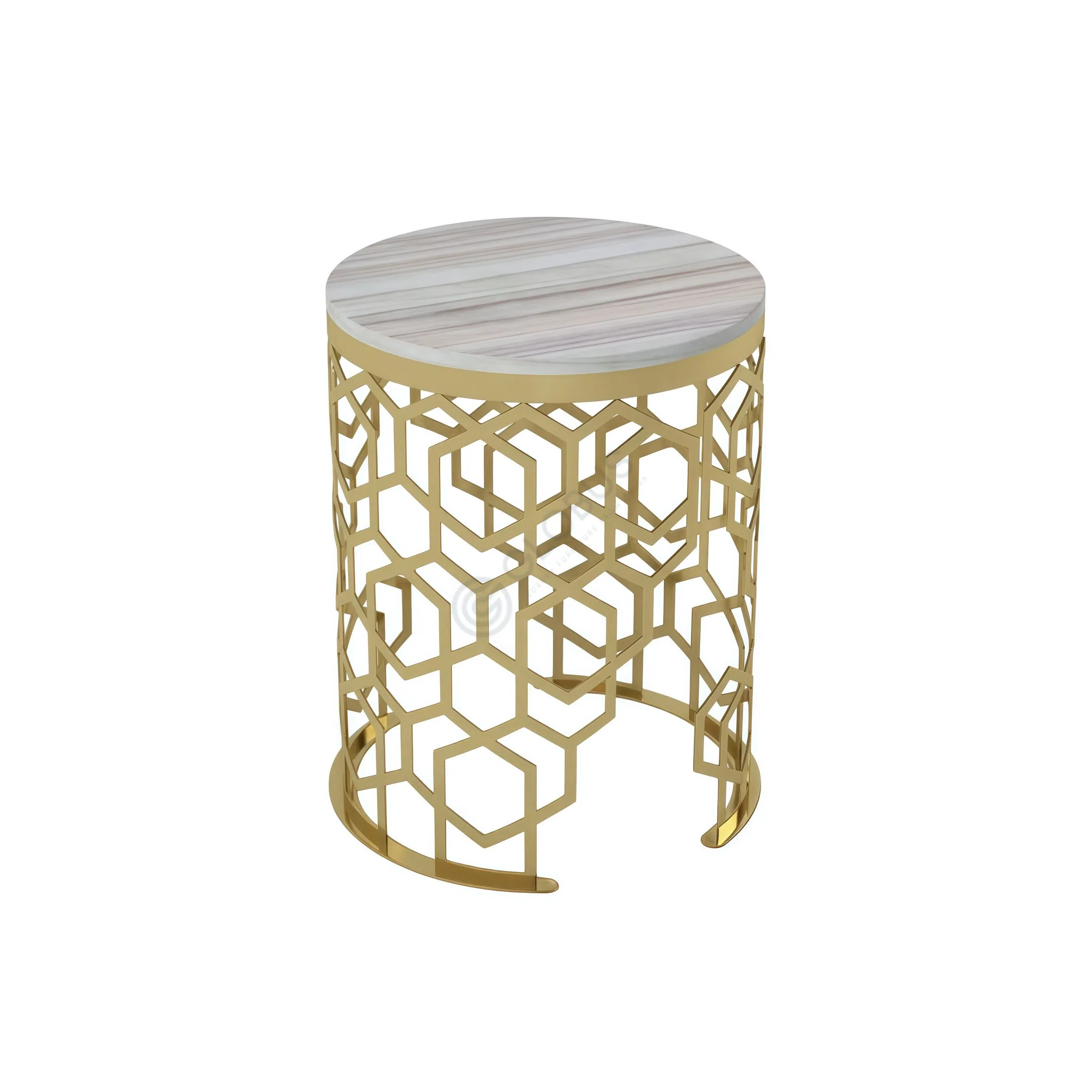The striking base is constructed from durable stainless steel, finished in a radiant gold hue. This intricate framework showcases a beautiful geometric design, creating an open and airy feel. A distinctive cutout on one side adds a unique architectural detail, enhancing the table's contemporary appeal.