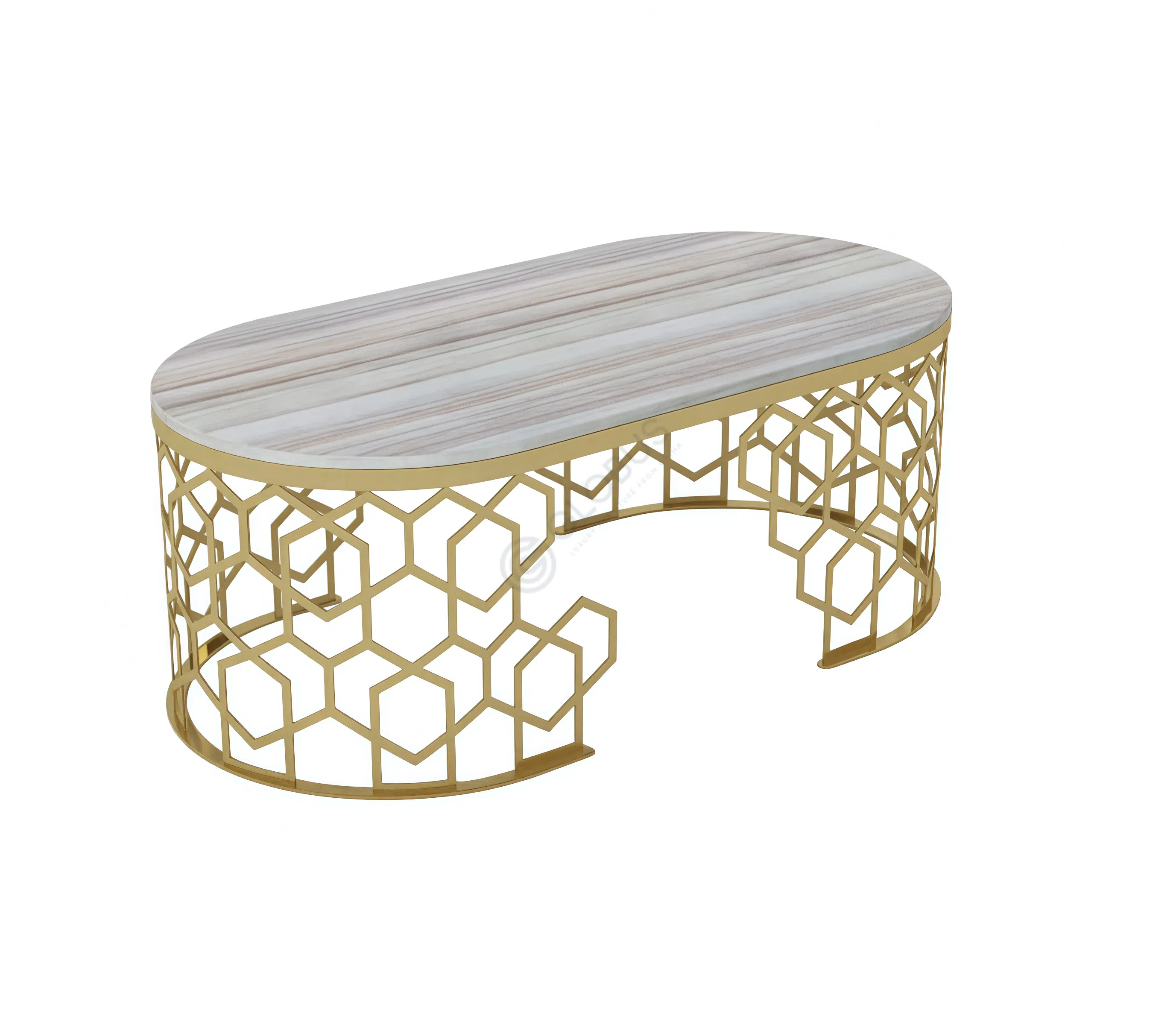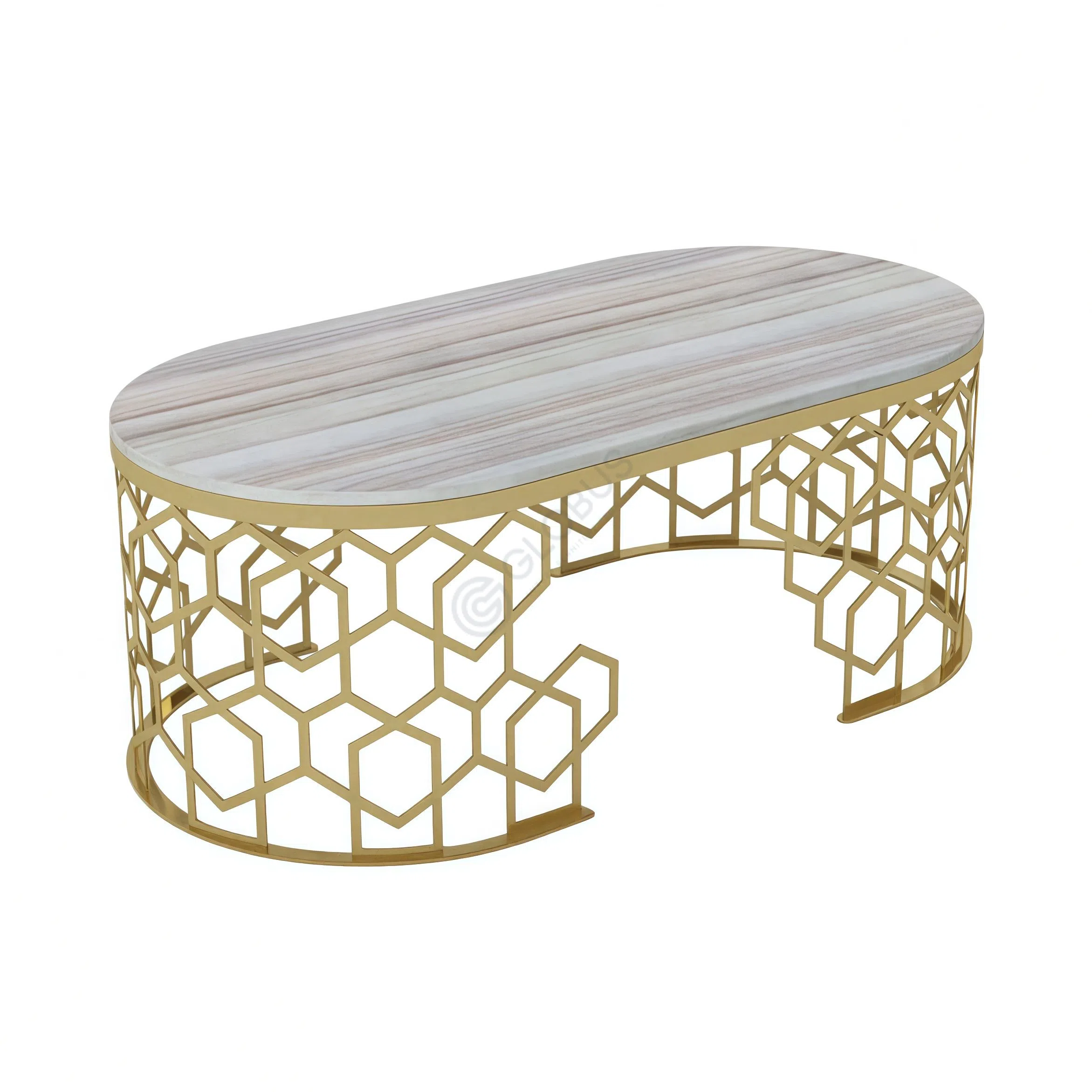 Complementing the top is a striking base made from polished stainless steel, finished in a rich, gleaming gold. The base showcases an intricate, openwork hexagonal pattern that creates a captivating visual texture and a sense of lightness. This geometric design wraps around the cylindrical form, adding depth and architectural interest.