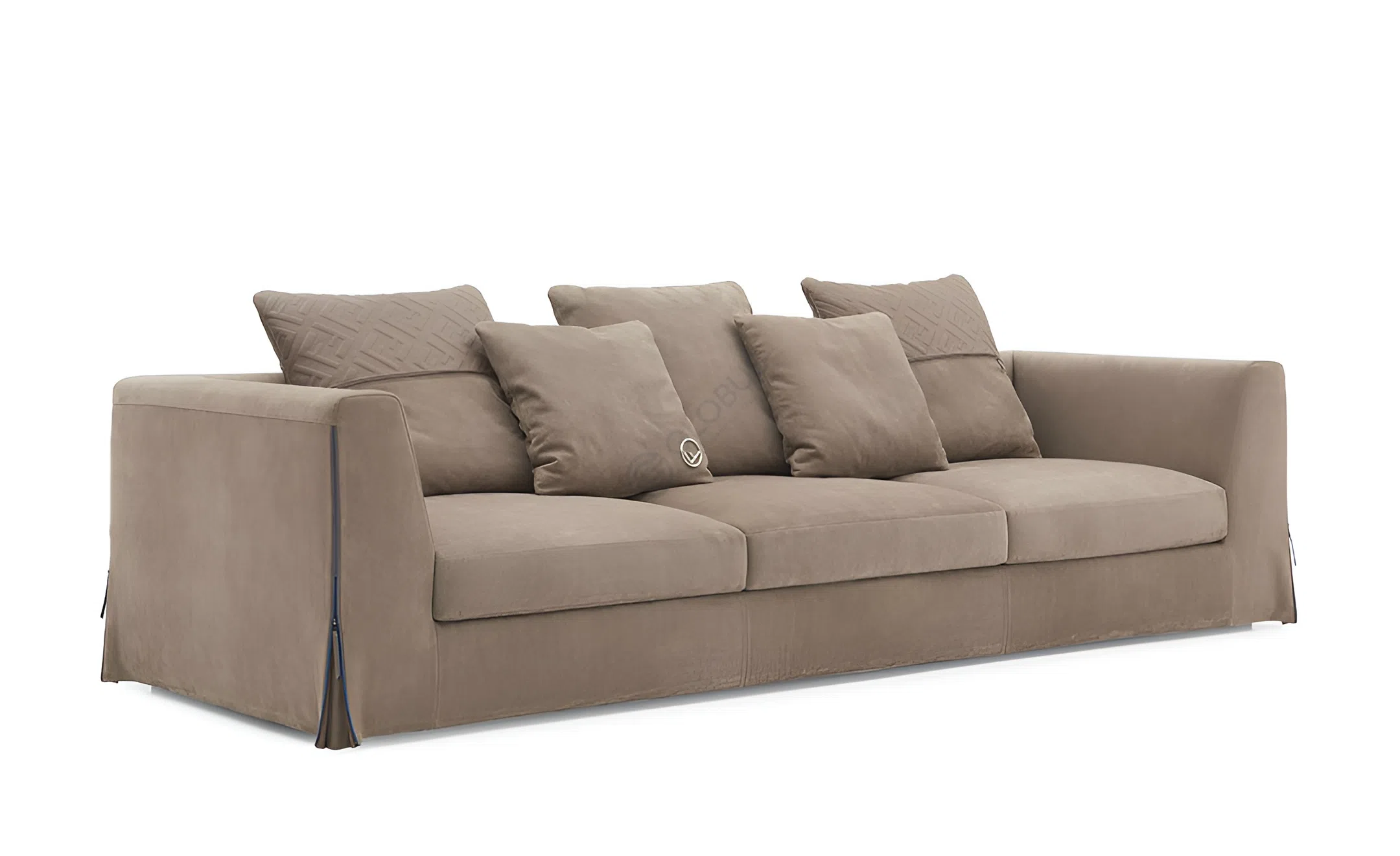 This modern bed offers a serene centerpiece for a contemporary bedroom. Its design, rooted in a solid wood structure, is fully enveloped in a fine textile, combining enduring quality with an inviting softness.