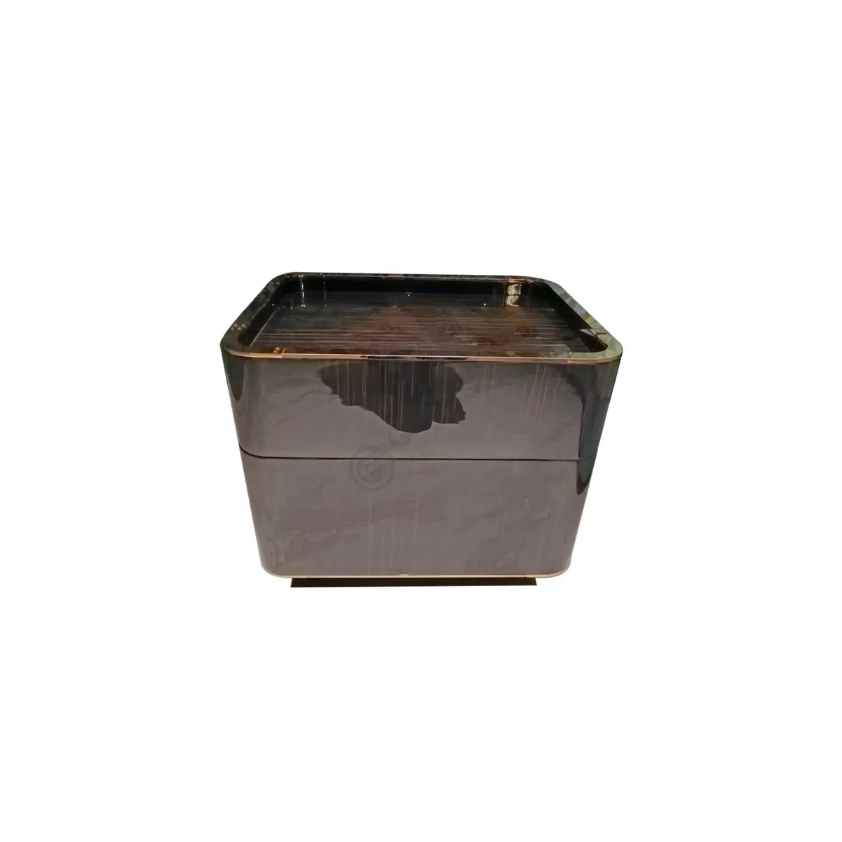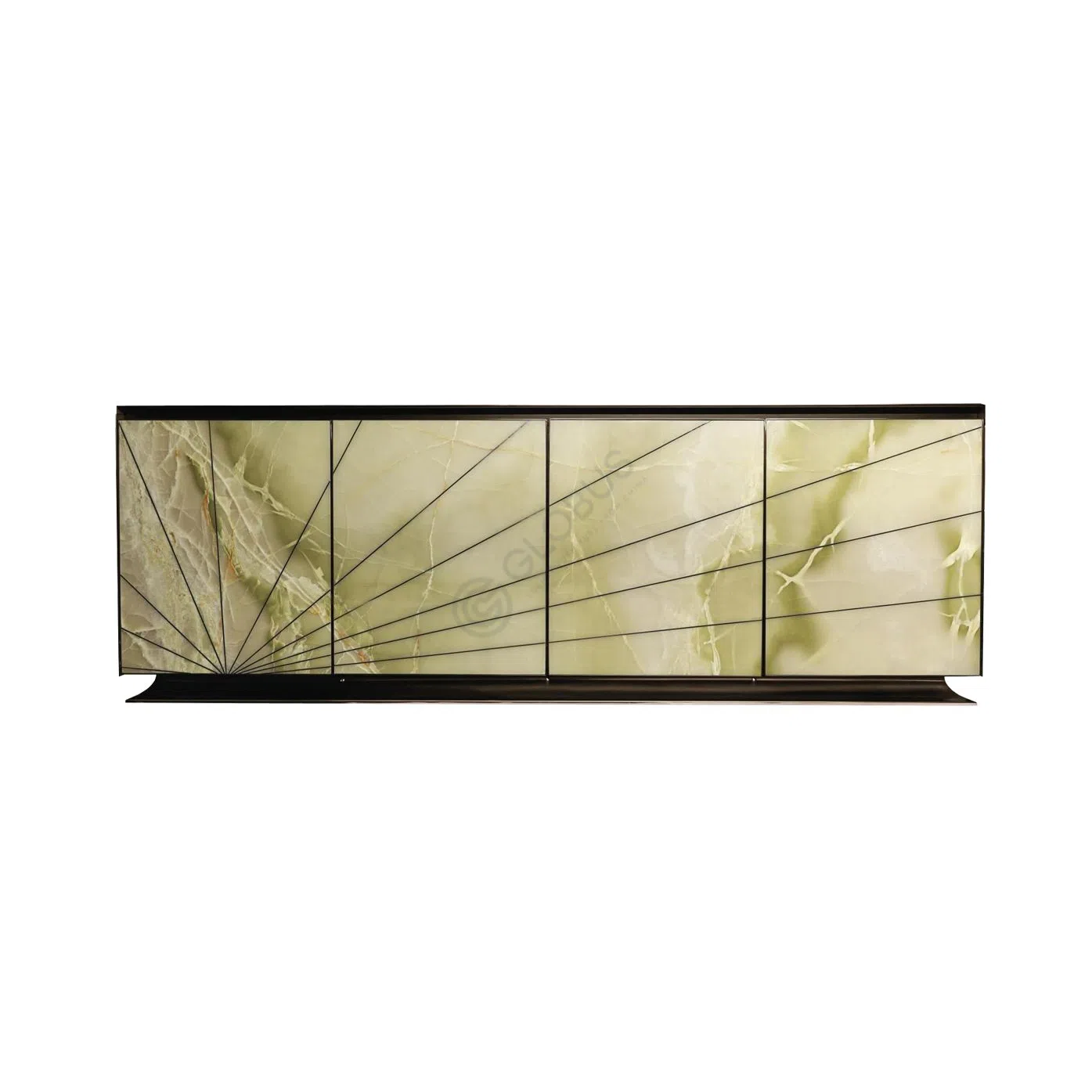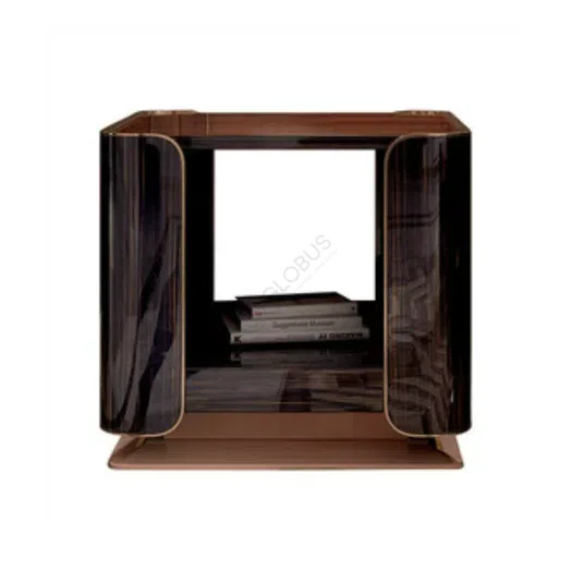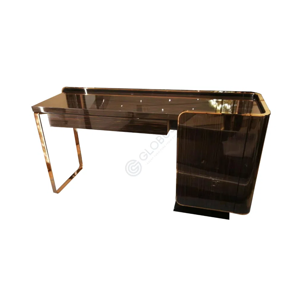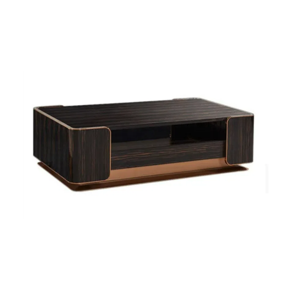 The sturdy base is crafted from solid wood, featuring sleek, tapered legs finished in a rich, dark tone. Elegant brass accents cap the feet of the front legs, introducing a touch of refined luxury and stability.