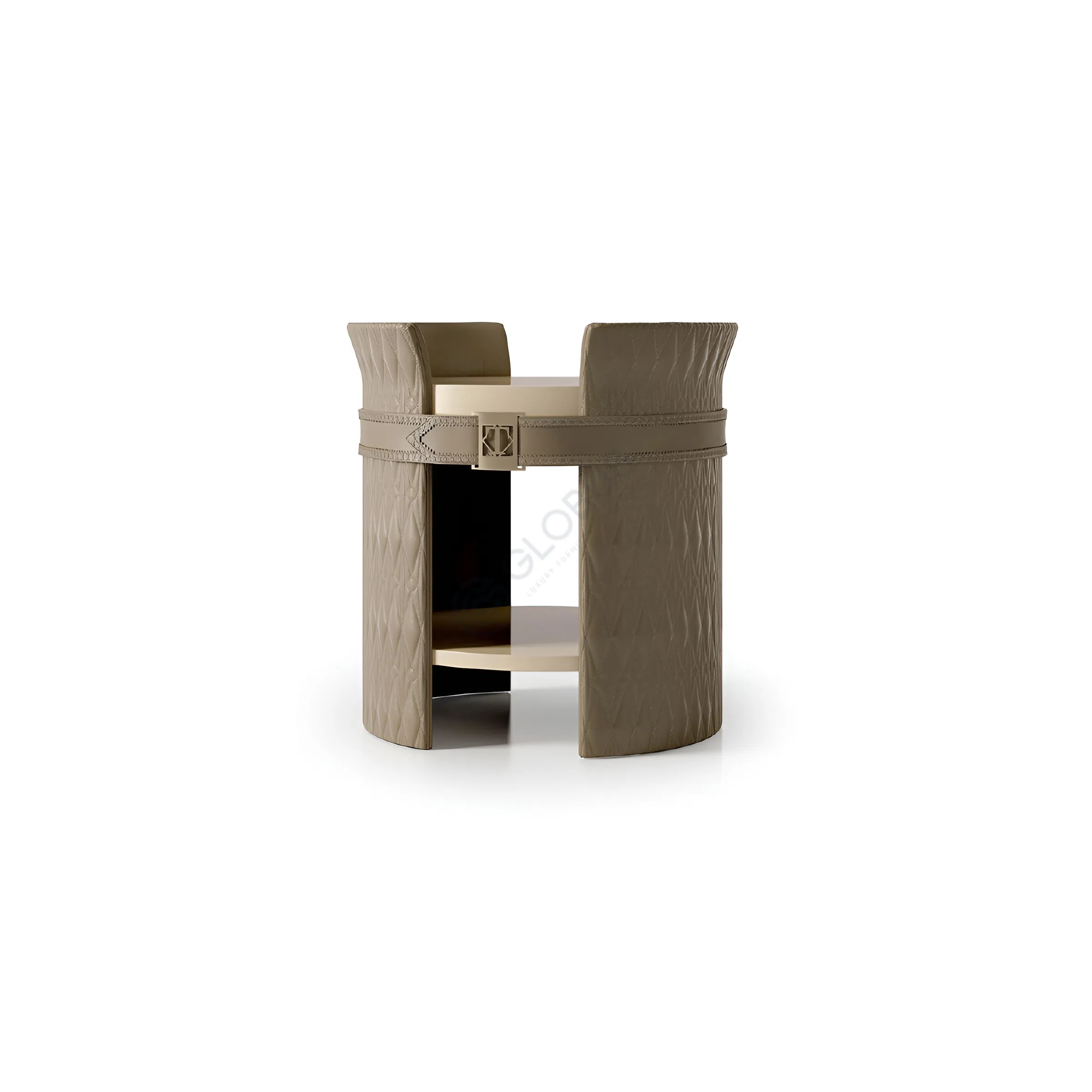Crafted on a robust plywood frame, the stand combines durability with refined materials. Stainless steel handles in a brushed gold finish punctuate each drawer, offering subtle metallic accents without overwhelming the design. Precision stitching along the leather edges underscores thoughtful workmanship.