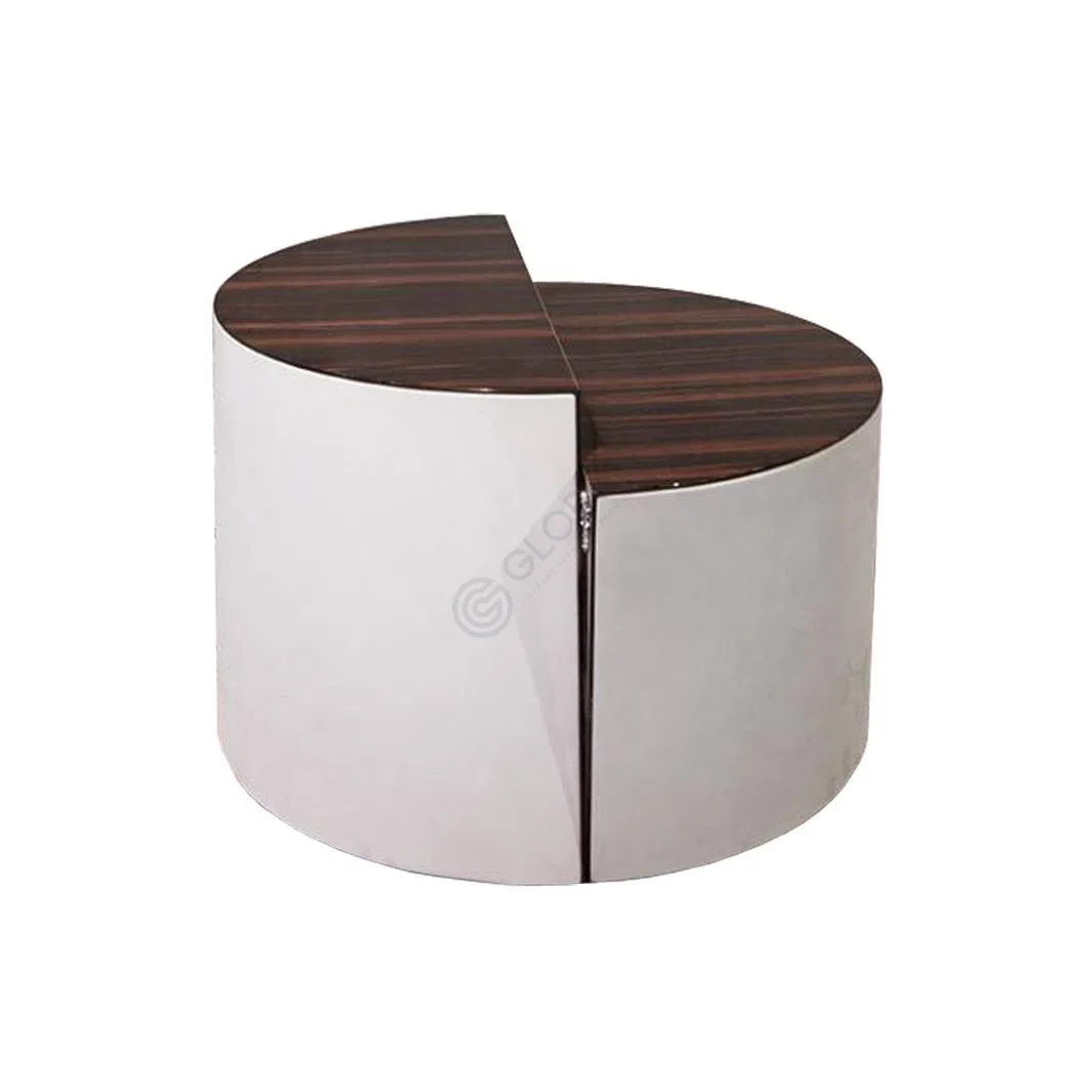 A modern side table featuring a striking combination of polished stainless steel and warm natural wood veneer. This piece brings a contemporary architectural feel to any living space.