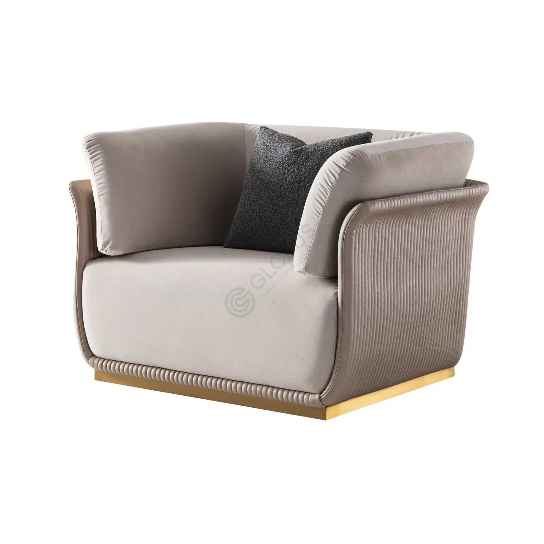 Built on a sturdy internal frame of solid wood, the sofa is elevated slightly by a sleek stainless steel base detail, which provides a touch of refinement. This combination of materials and form blends modern elegance with a subtle nod to Art Deco glamour.
