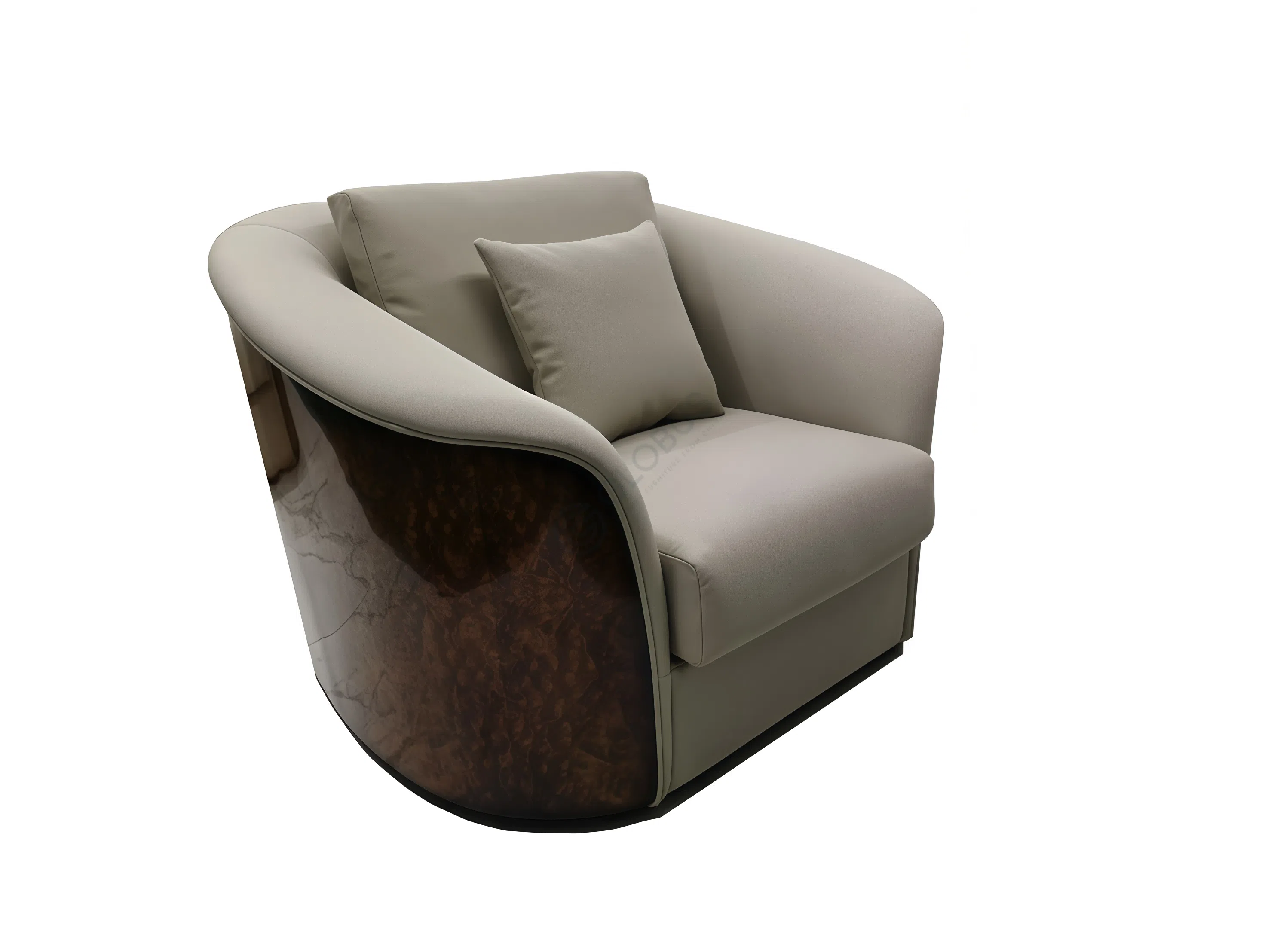 The design masterfully blends a serene light-toned textile with the deep, captivating patterns of natural wood veneer that gracefully adorn the outer arms. This exquisite veneer, rich in character, creates a striking visual contrast, drawing inspiration from both modern aesthetics and the intricate detailing reminiscent of Art Deco elegance. Beneath its elegant exterior, a robust framework of solid wood, reinforced with metal elements, ensures lasting quality.
