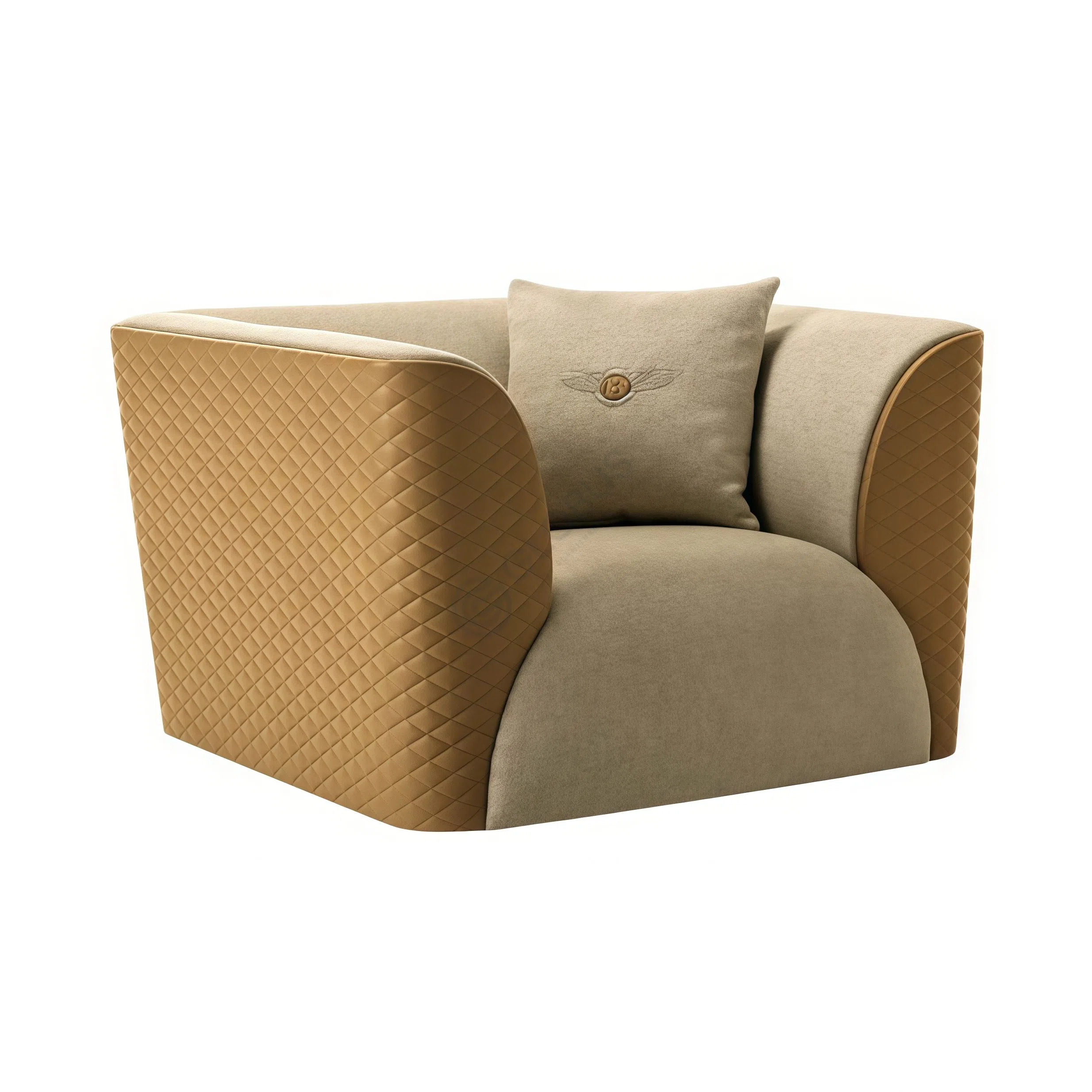 Crafted with a robust frame of solid wood and plywood, this sofa is built for lasting enjoyment. The main seating area is upholstered in a smooth, cream-toned microfiber leather, offering a soft touch and luxurious feel. A distinctive quilted pattern in a warm tan microfiber leather adorns its curved side panels, providing a subtle textural contrast and a touch of tailored elegance.