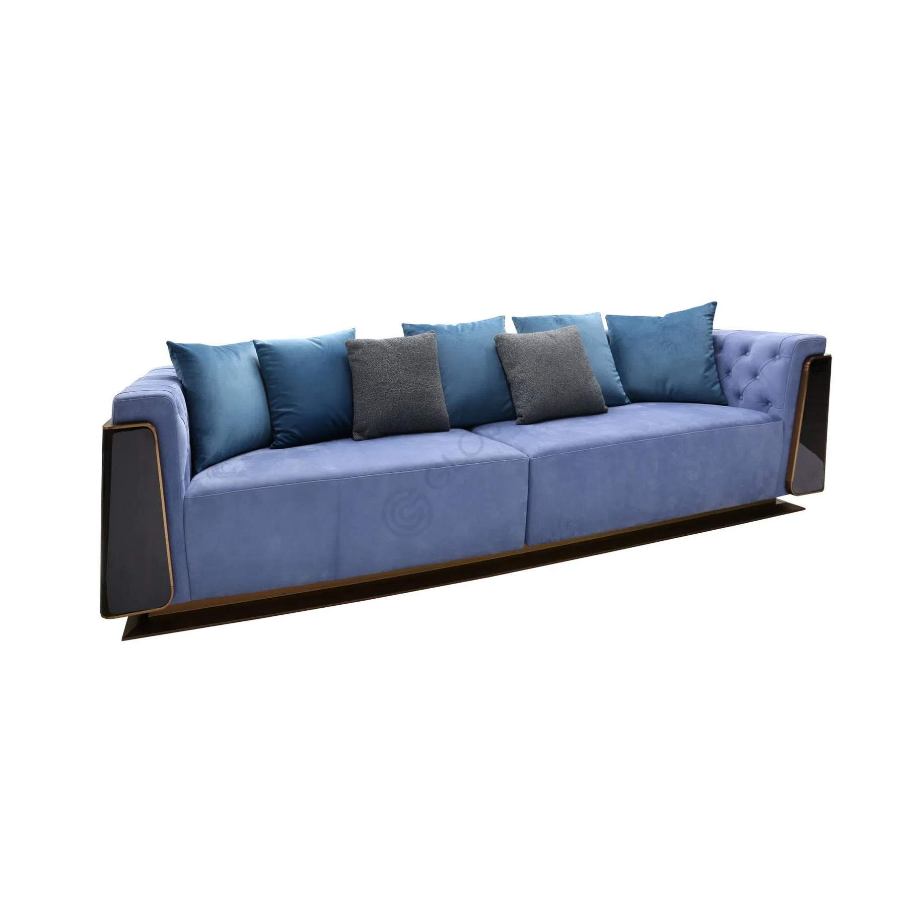 Crafted from a combination of premium materials, this piece ensures both beauty and durability. It is upholstered in soft suede leather, offering a smooth, inviting feel in a beautiful blue shade. The seat cushion is filled with feather, providing a plush and comfortable seating experience. The distinctive outer arm panels are made from natural veneer on an MDF base, showcasing a rich grain and a glossy finish, accented by sleek stainless steel framing that complements the base of the chair. The internal structure is built with solid wood for lasting support.