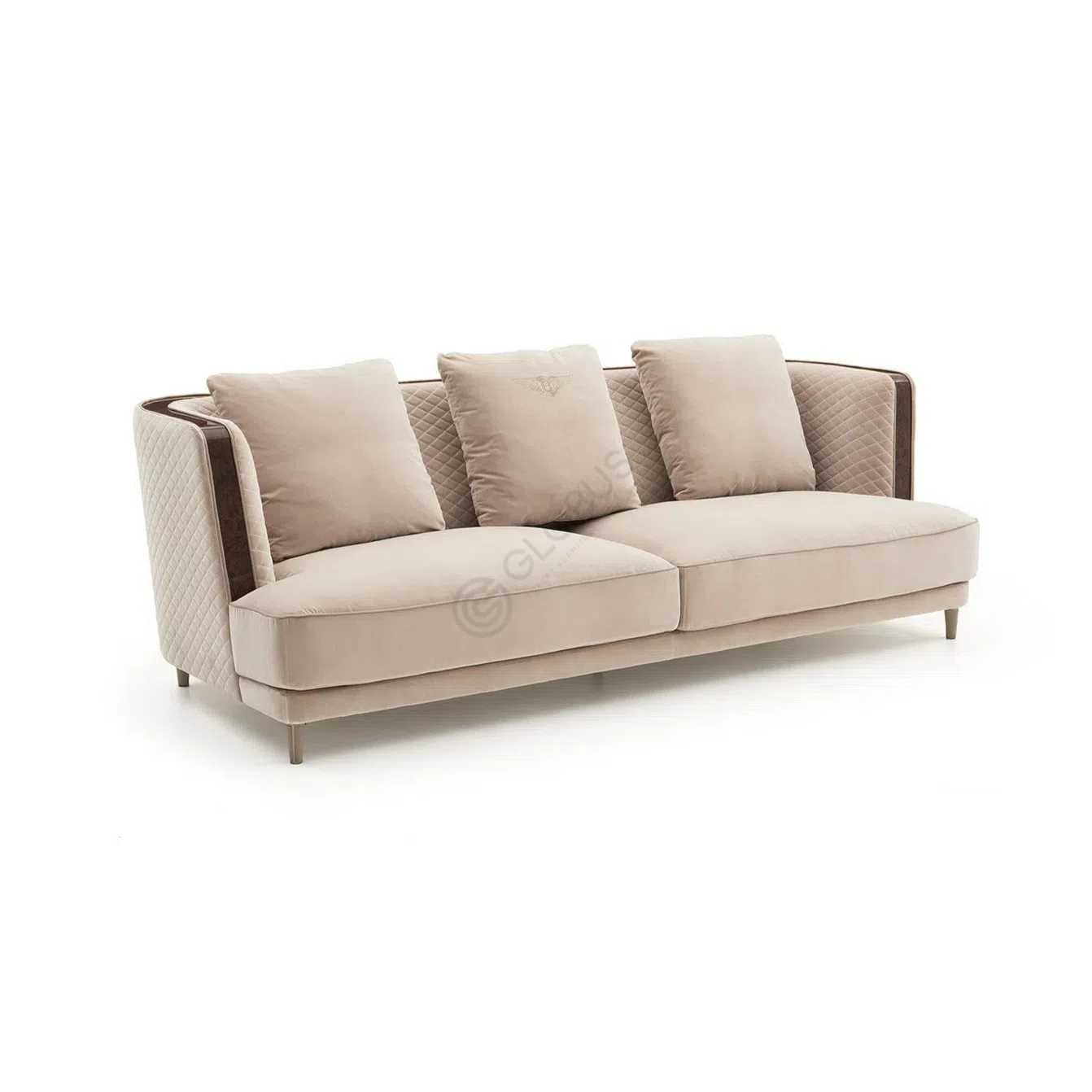 The design features clean lines and a structured profile. Subtle diamond quilting graces the back panel, adding a touch of visual interest and texture. A distinctive dark vertical accent panel on the exterior of the arms introduces a tasteful contrast to the light microfiber leather upholstery, enhancing its sophisticated appeal.