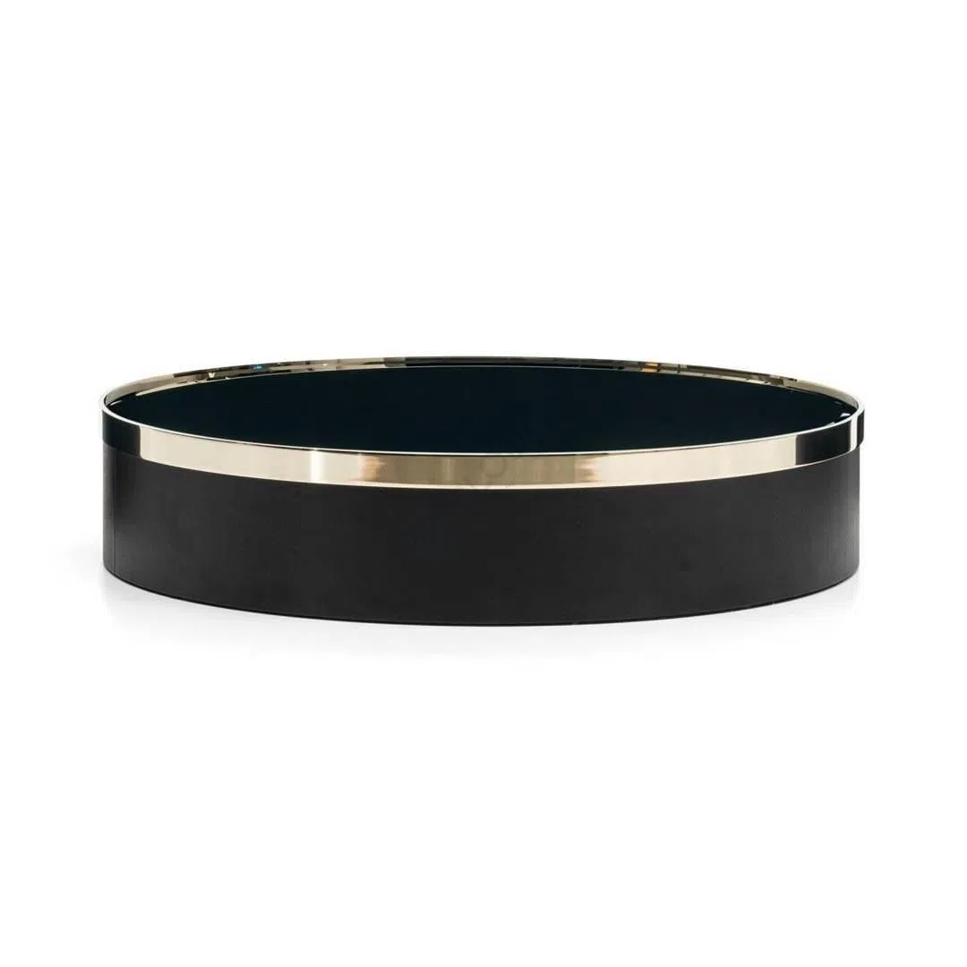 This piece showcases a thoughtful combination of materials. The body is finished in natural veneer, offering a beautiful texture and depth. A polished metal band encircles the top edge, providing a sophisticated metallic detail that catches the light.