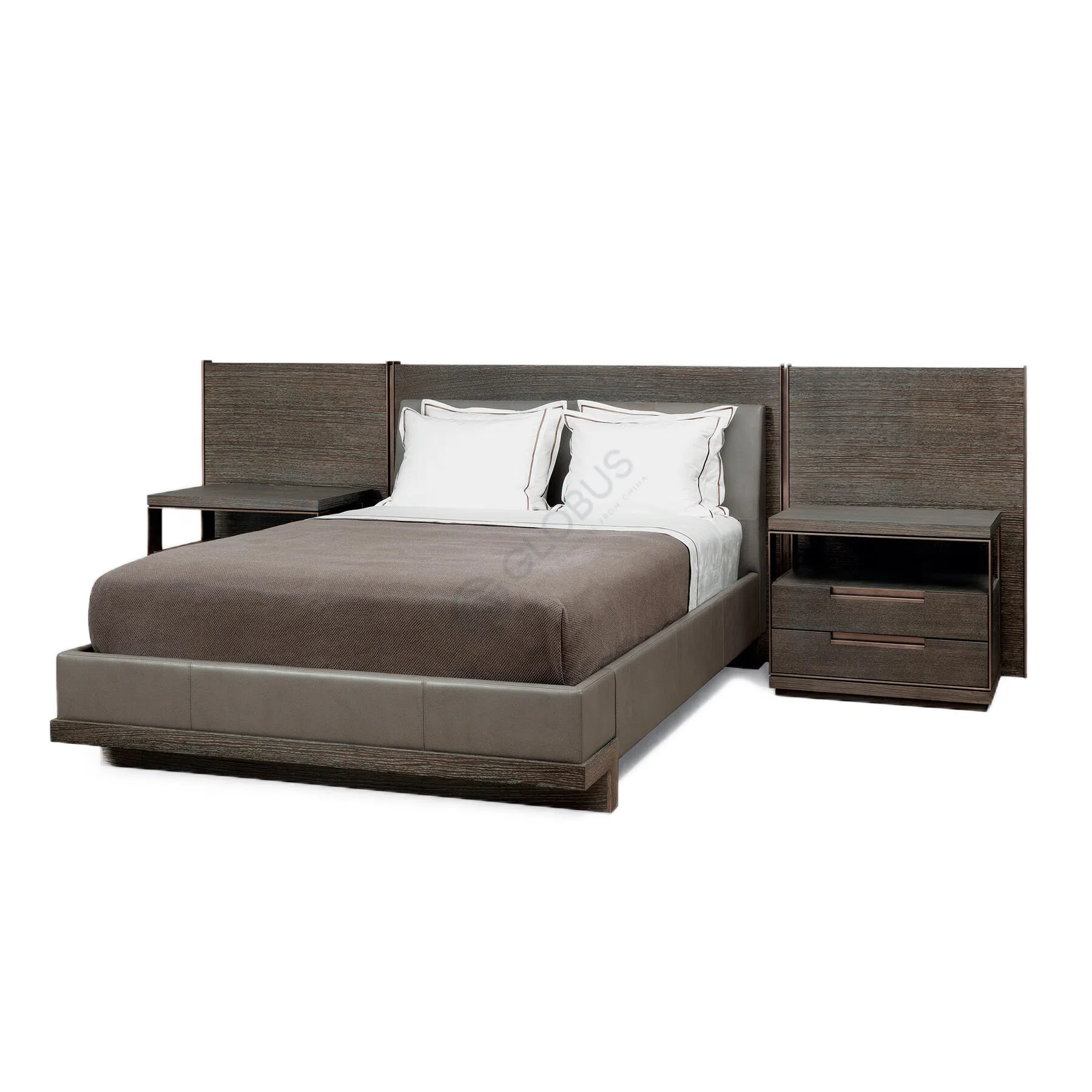 Crafted from solid wood and MDF for stability, with copper details that add a warm contrast and durable character. The plinth base provides a stable stance beside the bed, and the smooth, low-sheen finish highlights the natural grain without overpowering the space.