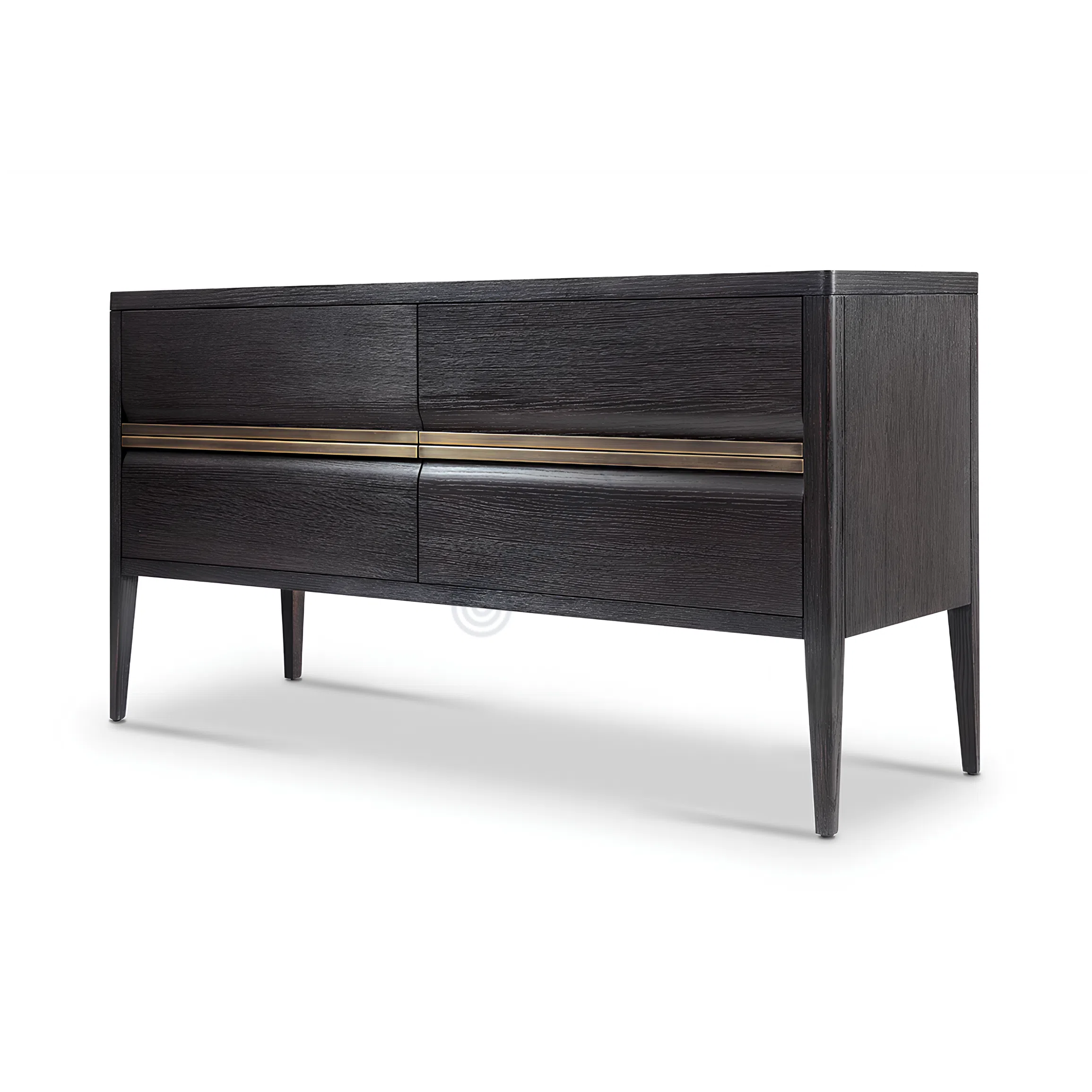 An elongated sideboard in deep-stained solid wood, crowned with a slab of natural black marble featuring subtle, organic veining. Vertical copper inlays articulate the four-panel front, echoed by copper-capped feet that lift the body lightly from the floor. Rounded edges and a flush silhouette keep the profile clean and modern while nodding to Art Deco geometry.