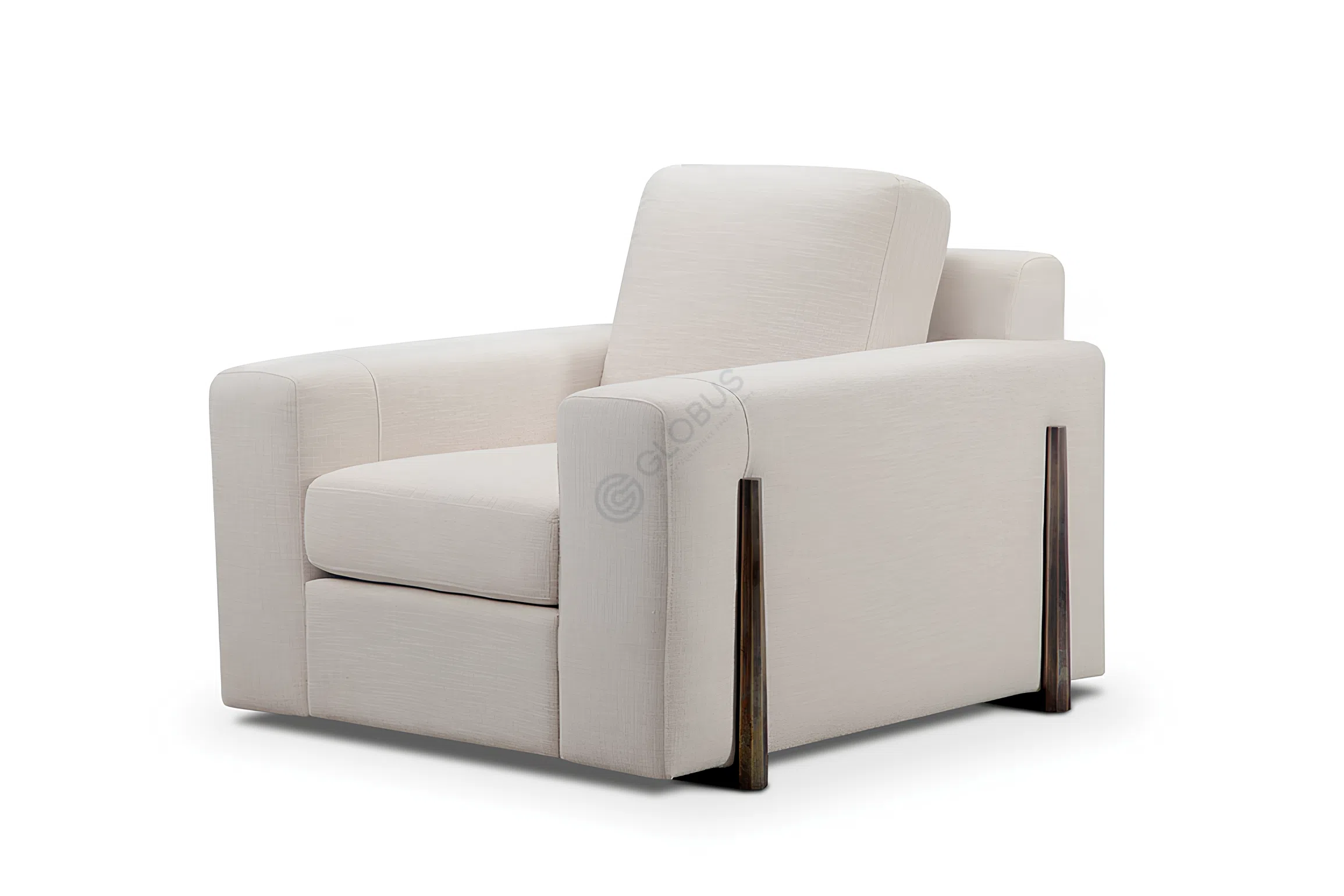 Built on a solid wood frame, it offers lasting stability while keeping a refined profile. Discreet copper accents at the arm details add a subtle note of warmth and sophistication, complementing the smooth fabric texture.