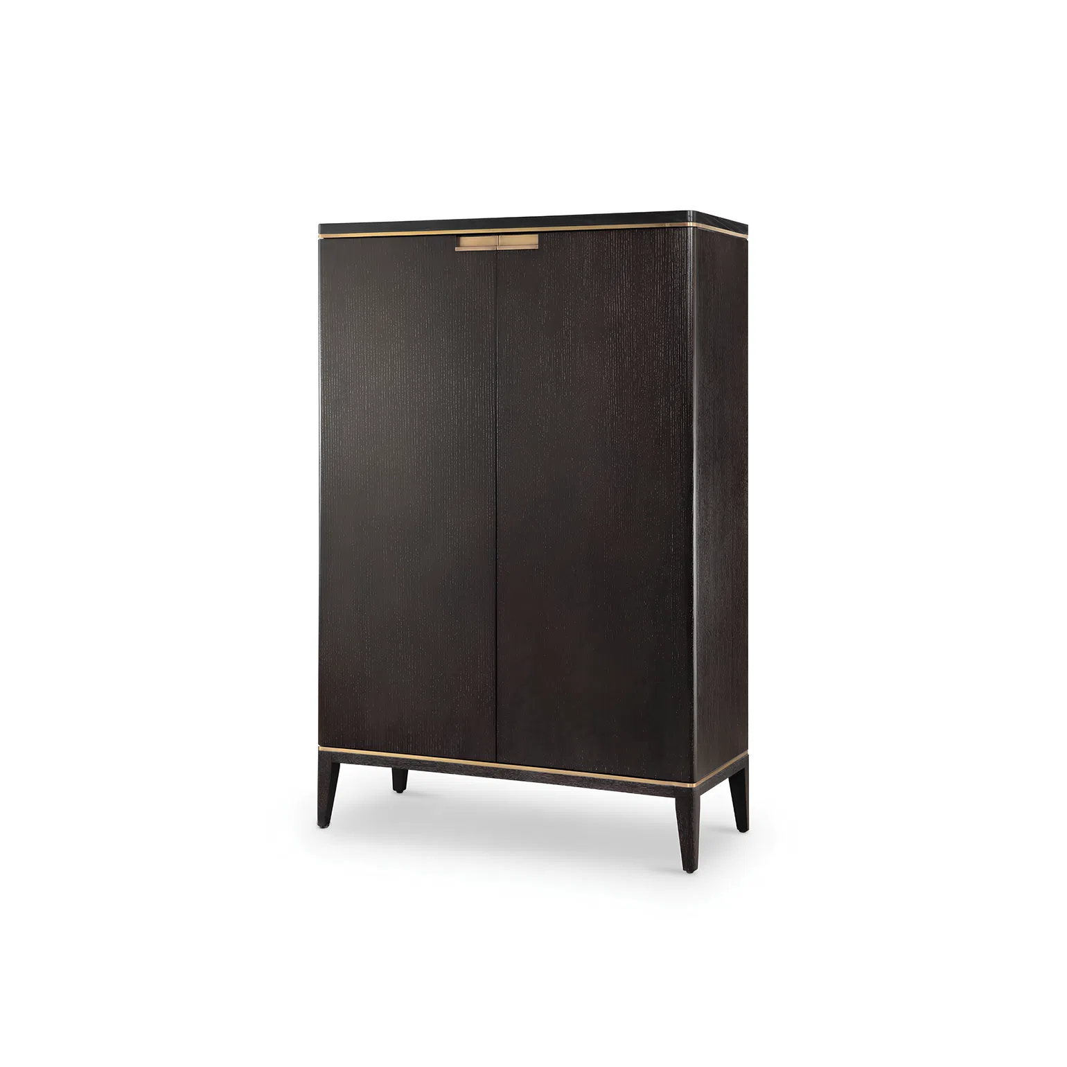 A slim modern dressing table with a charcoal-toned veneer and clean lines, set on tapered legs. A refined copper band traces the top edge and continues across the drawer fronts, adding a warm contrast to the deep wood grain.