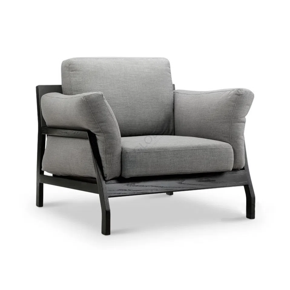 This modern sofa presents a clean and elegant profile, designed to enhance the contemporary living room. Its distinctive frame, crafted from solid wood and finished with natural veneer, features an open structure with gently curved arms, creating a sense of lightness and sophistication. The dark wood finish provides a striking contrast to the soft grey upholstery.