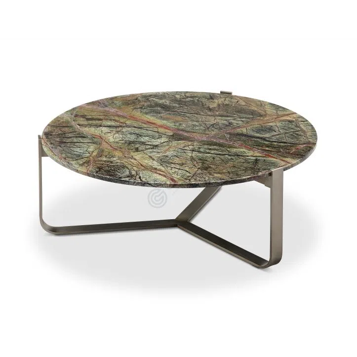 The table features a circular top made from natural marble, showcasing its inherent beauty through unique veining patterns. Each stone top possesses its own distinct character, ensuring individuality. Supporting this natural element is a base expertly formed from stainless steel. The metalwork presents smooth, flowing curves and a sophisticated finish, creating a supportive structure that is both strong and visually appealing.