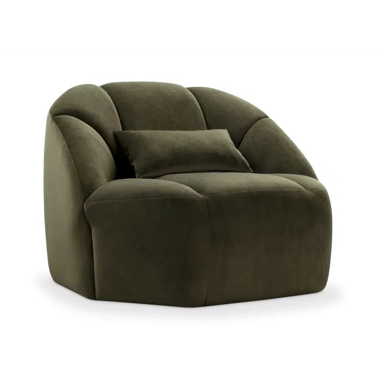 This modern pouf presents a unique octagonal form with a luxuriously cushioned top, divided into sculpted panels. Upholstered in a soft, inviting textile, its deep, muted colour adds a sophisticated touch to any setting, creating an immediate sense of comfort and style.
