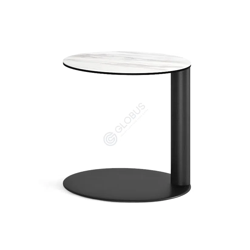 Supporting the top is a robust base made from carbon steel. It features a strong cylindrical column rising from a substantial round floor plate, ensuring stability while maintaining a light visual presence. Integrated glass elements complement the design.