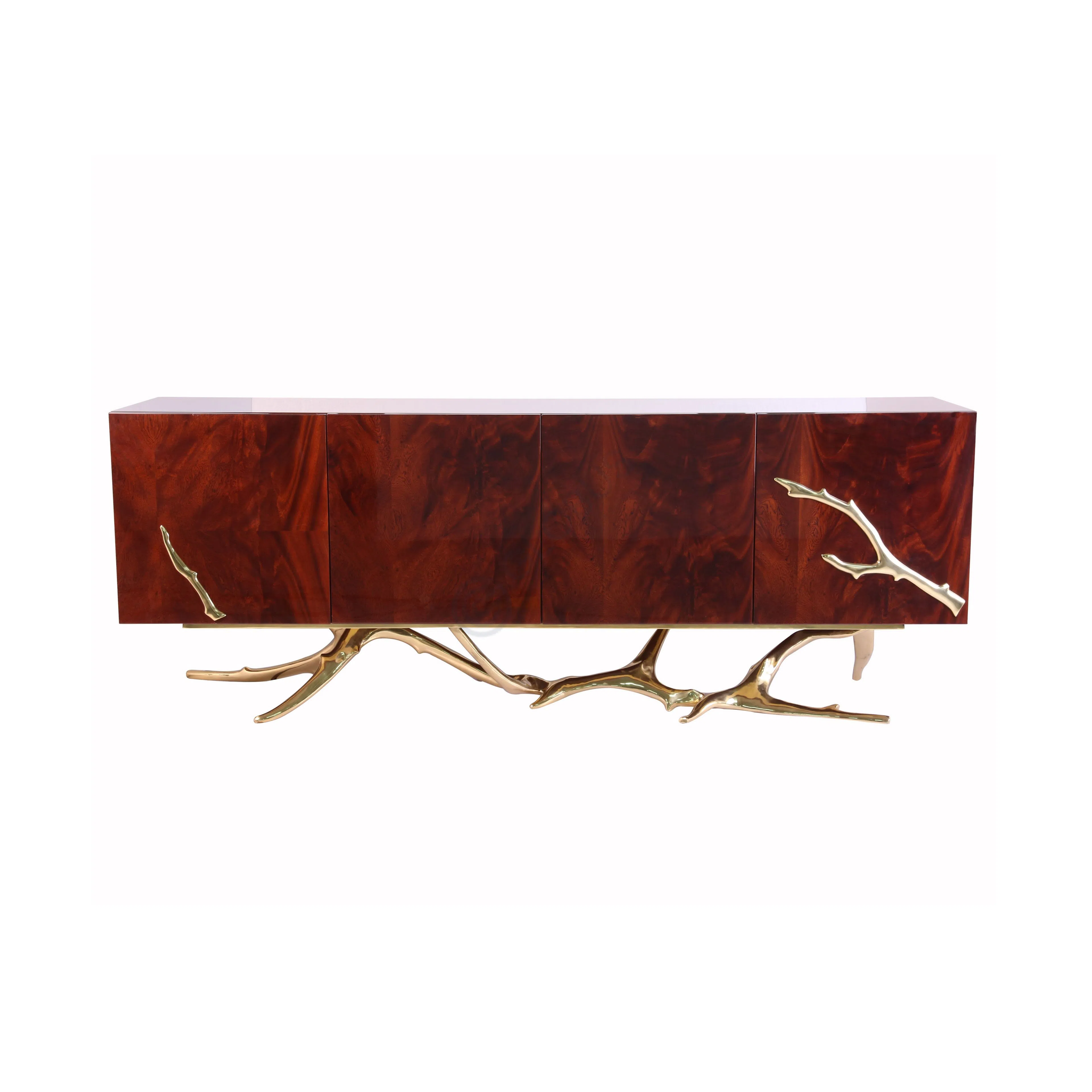 Crafted from solid wood, the console offers durability and a sense of quality. The intricate, flowing elements are crafted from copper, providing a luxurious contrast and artistic elegance. This combination of materials highlights quality and distinctive design.